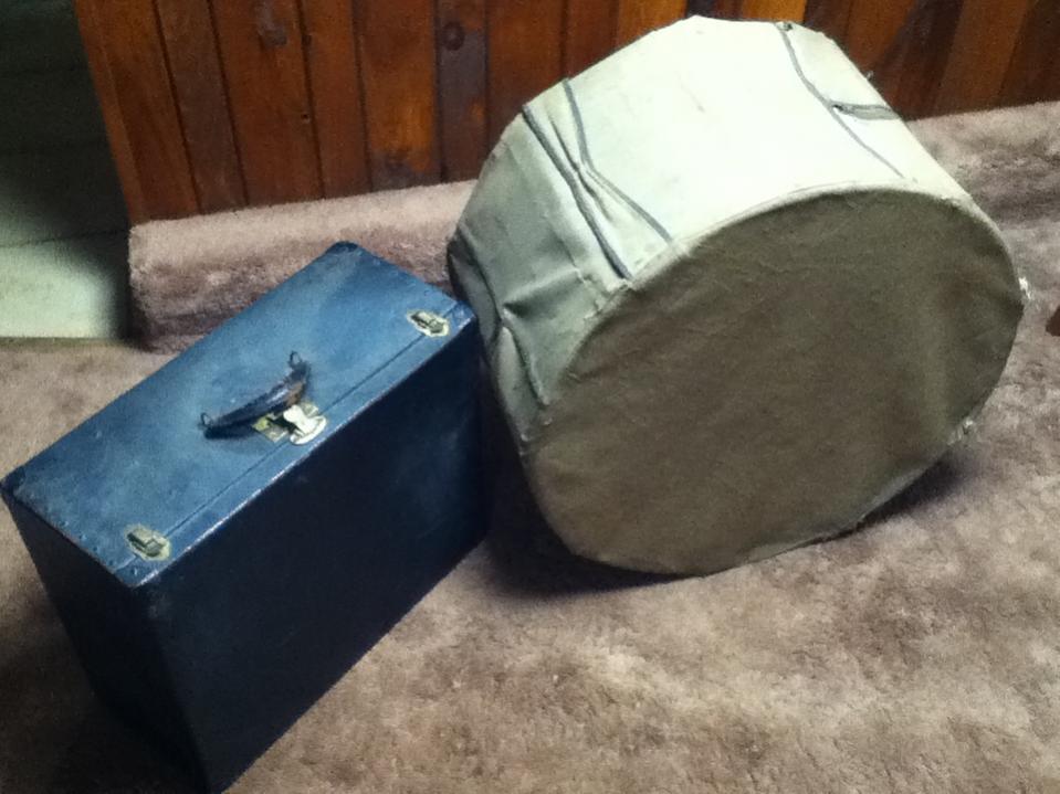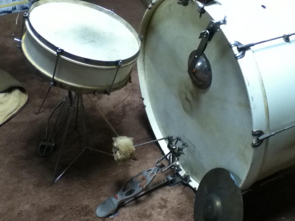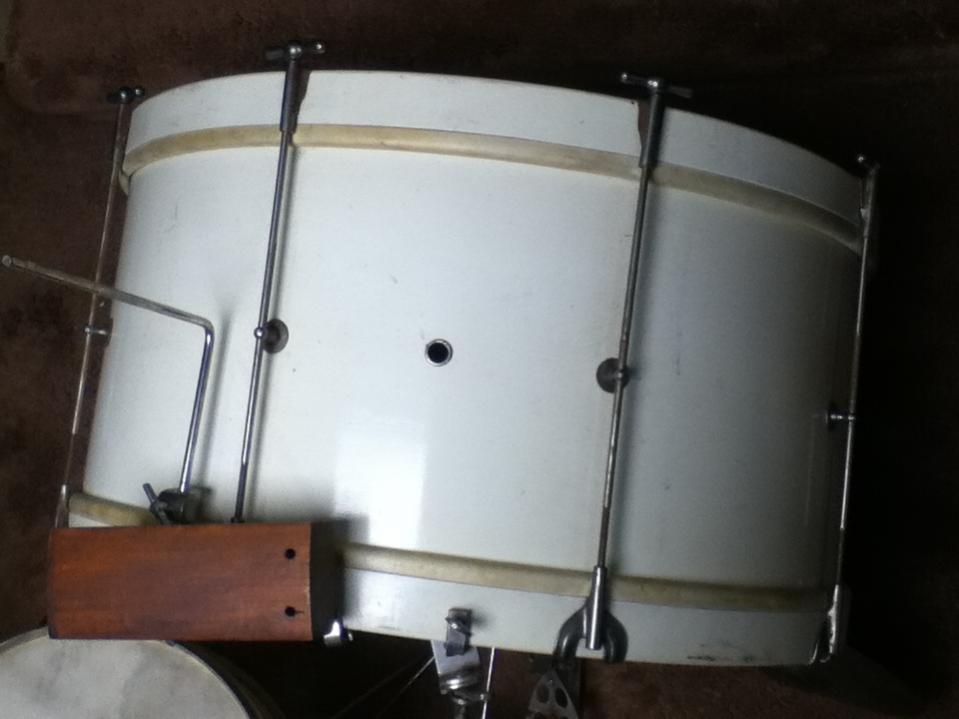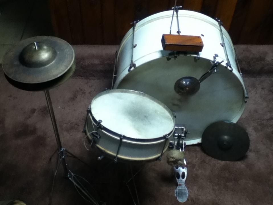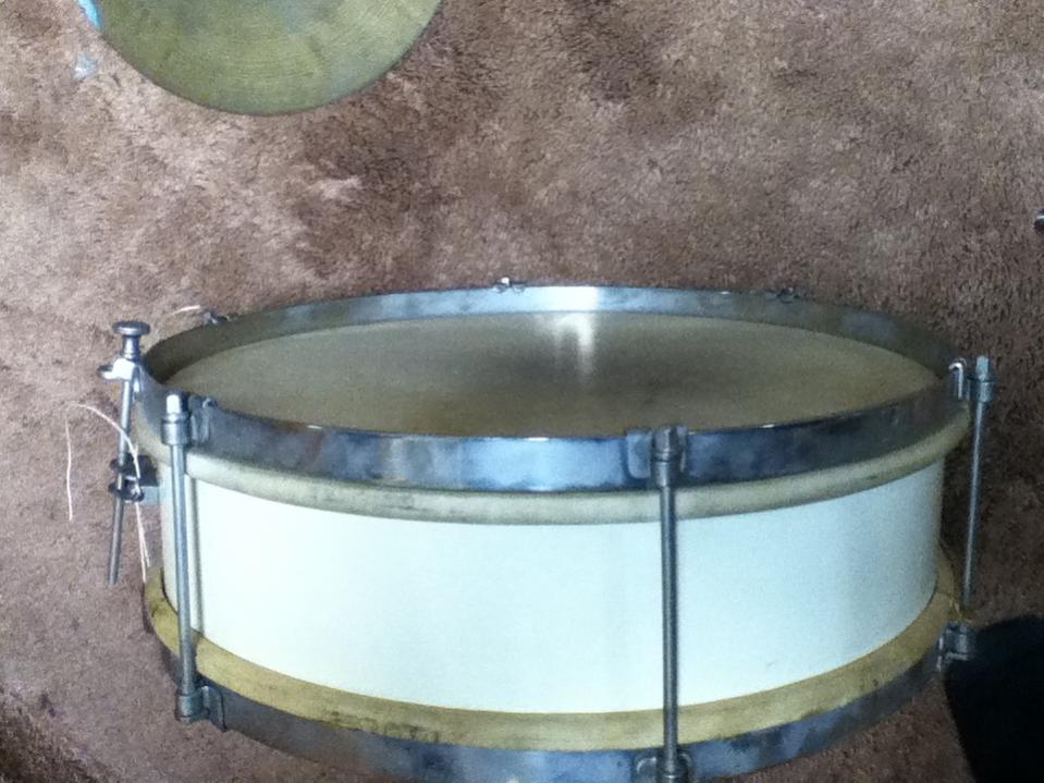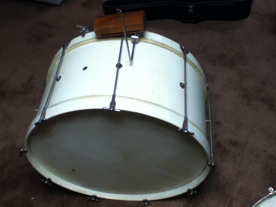really cool old kit in great condition 26x12, , original calfs , original antique white , matching snare , awesome bell hi hats, a cymbal , unique bass drum pedal and other assorted pieces of hardware. You will get exactly what you see in the photos.