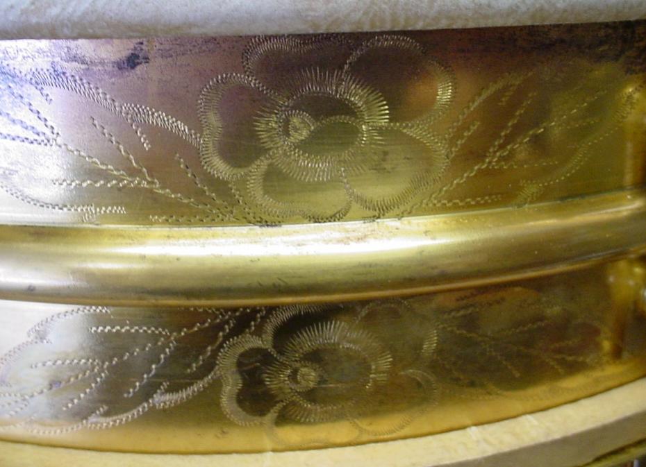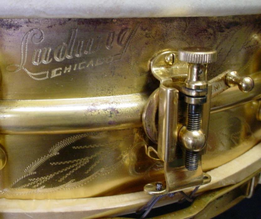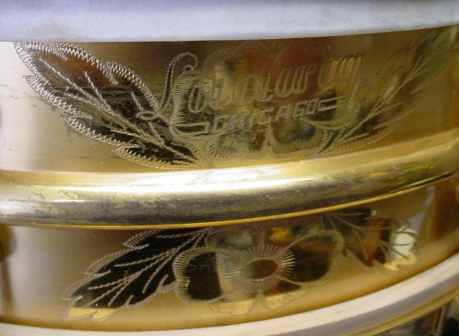 As stated earlier, the drum is definitely a 1920s Ludwig & Ludwig gold plated /engraved Triumphal Model. I did notice a few minor differences as compared to my Triumphal... 1. This drum has a 5-petal rose engraving as compared to my drum that has a 6-petal rose engraving... 2. This drum has the “Ludwig Chicago” in the same panel as the P-338 strainer as compared to my drum where the “Ludwig Chicago” is located 2 panels to the left of the strainer. Nothing earth shattering but interesting enough for me to pursue it further, ergo; was this a different engraver than my drum? I know that L & L used 3-4 different engravers in the 1920s so I asked my good friend and Italy’s gift to the custom drum making world, Adrian Kirchler (AK Drums) and fellow collector, drum historian and master engraver John Aldridge to weigh in on this. Adrian’s opinion was: “it’s not said that they’ve been engraved by two different engravers. It might also be that they’ve been engraved at two different times (maybe several months in between!?). We know that there were not many of these made, and judging from my personal experience, it’s not easy to replicate the same engraving style on more drums if you engrave them at different times .. AND without having perfect and detailed photos of the engraving on hand (that was even more difficult in the 20s) my guess: – the ‘new’ drum has been engraved several months before your and Bob’s drums were engraved. - the engraver found the more asymmetric (5 petal rose) and the location of the ‘Ludwig Chicago’ engraving not an ideal and he changed to the symmetric 6 petal rose and central logo engraving on later drums.” John’s opinion was: ”I agree with Adrian on this one. I tend to refine patterns as I go. These weren't production model drums, so variations are to be expected.” Thanks to Adrian and John whose astute observations helped me to justify this purchase. The overall condition of the shell is better than the original photos showed. The gold plating is all there and well preserved, there was a little tarnish here and there but nothing that posed any problems in the cleaning process.