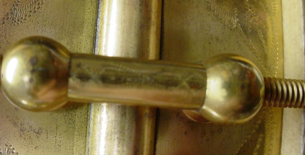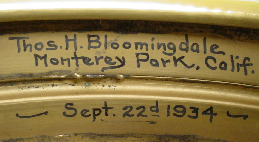 A brief history of ownership taken from the seller’s original Drumforum.org post and a little added information from our phone discussions: “I was given this snare drum several years ago by my stepfather, he found it in the garage of a house he had purchased, under a pile of trash in the corner. The drum has been in the family for 22 years, I’ve owned it for 10 years and the kids used to play with it. Eventually it ended up in a storage locker. I even brought it to the Antiques Roadshow but they knew nothing about the drum but they did verify that the drum was gold plated. I researched Thos H. Bloomingdale and found out that Sept. 22, 1934 was his 87th birthday.”