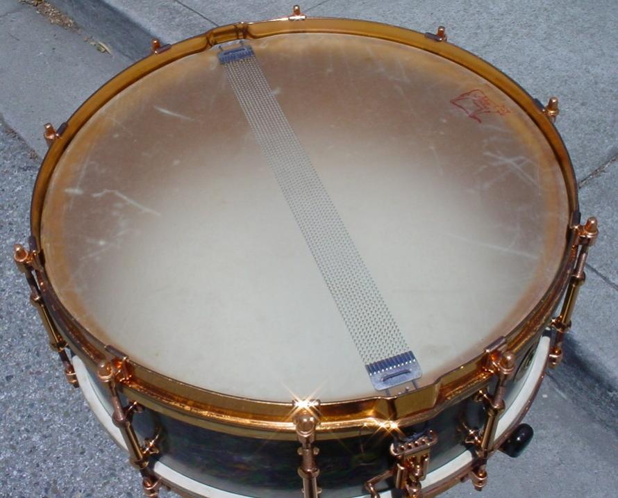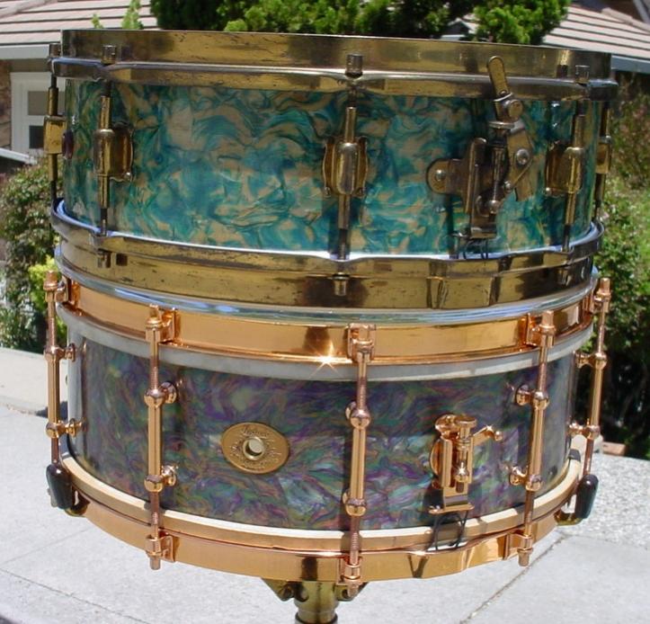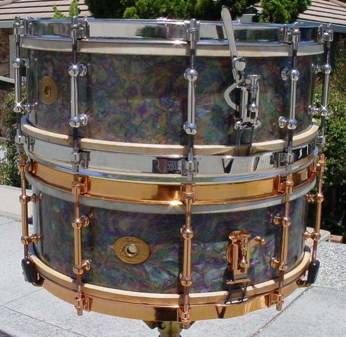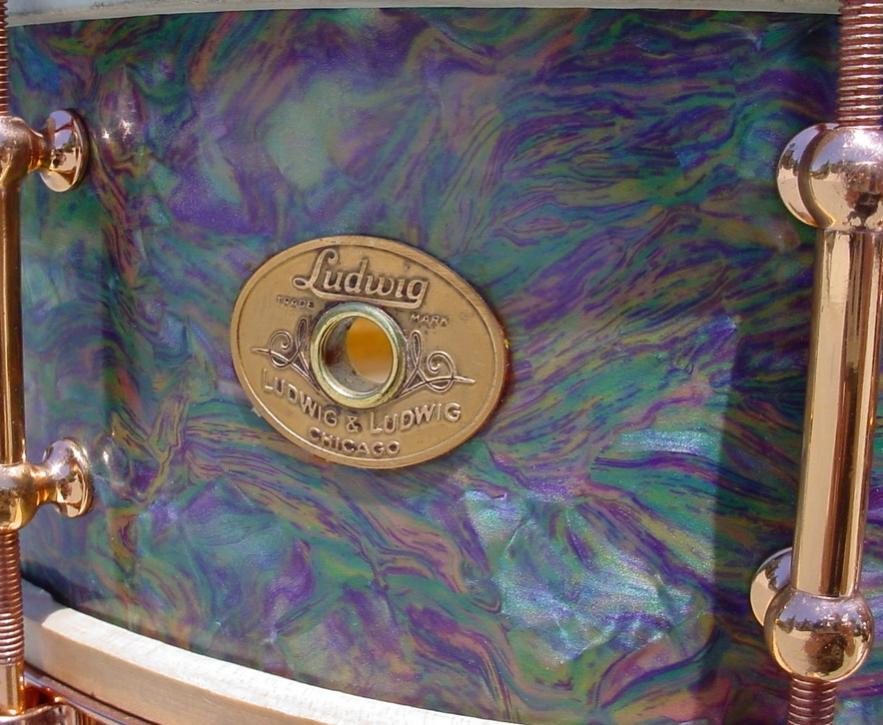 The real story is in the identification of the finish that is on this drum. I’ll try to explain as best as I can but there are definite inconsistencies that I will site along the way. The finish on this drum (and on the only other drum like this that I have ever seen) has been referred to as “Rainbow Pearl”. I have included a comparison photo of both drums. Ludwig & Ludwig never had a cataloged finish called Rainbow Pearl but they did have the Rainbow Outfit but the drums were finished in Lavender Pearl (1928-35). Leedy introduced Rainbow Pearl in 1930 and it has been suggested that the finish on this drum was taken from the “Leedy side” of the building as Leedy and Ludwig & Ludwig were literally built across the way from each other as they were both owned by the C. G. Conn Co. at that time but the Leedy Rainbow Pearl snare that I own does not look at all like the “Rainbow Pearl” drum in this article. I have also included a comparison photo of the Leedy drum and this drum so the reader can see what I am talking about. Another theory is that this could be a variation of a “run” of 1928-30 Peacock Pearl. More photos are available on page 153 of The Ludwig Book by Rob Cook, this is a nice presentation of Peacock Pearl I and Peacock Pearl II. Please note that at the top of page 153 Rob lists Peacock Pearl version I (1928-30) and Peacock version II (1930-32) but reverses the the order in the photos; the top photos should be labeled Peacock Pearl II and the bottom photos should be labeled Peacock Pearl I and be aware that the drum in the lower left is the “other” Rainbow Pearl drum that I mentioned earlier. Having fun yet, are you still with me? So what are we going to call this finish...Rainbow Pearl, Peacock Pearl I, a variation of Peacock Pearl I, a one-off run of an un-cataloged finish, a one-off special order, frog in a blender, Walt Disney threw up? No matter what we call it I have come to really enjoy collecting this finish even though, as my good friend John Aldridge says, “that finish is as ugly as home made soap!” As always I welcome your comments, observations, information AND photos if you own a drum like this or if you have seen or heard of another drum like this one.
