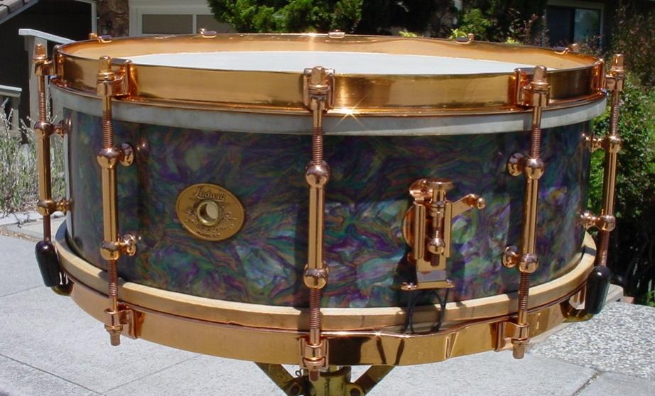 I just got this 1928-30 5 x 14 Ludwig & Ludwig “Rainbow Pearl”/DeLuxe Standard Model snare drum from my good friend and fellow collector Donn Bennett of Donn Bennett Drum Studios in Belleview, WA. The drum needed no cleaning or restoring. The solid maple shell interior is clean with a tight grommet/badge and the “finish” is very clean. There is no tone control, tone controls show up in the L & L catalog around 1932 hence the 1928-30 dating. The DeLuxe hardware was restored by Adrian Kirchler of AK Drums in Italy. The only thing I added was of-the-era top and bottom Ludwig & Ludwig calf heads and Ludwig & Ludwig Snappi-type wires.