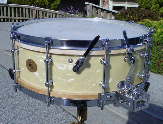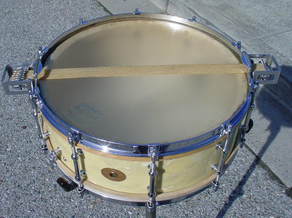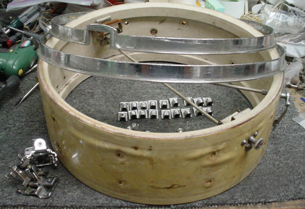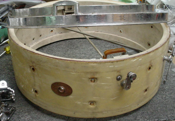 Here's another one for the collection. This snare drum has been, as my good friend John Aldridge says: "ridden hard and put up wet" and was very close to being relegated to the parts bin but was able to be salvaged at the last minute...more on this as you read on.