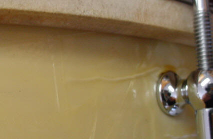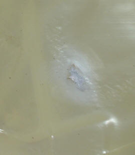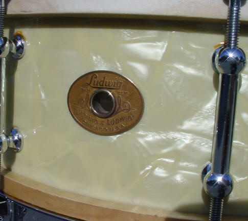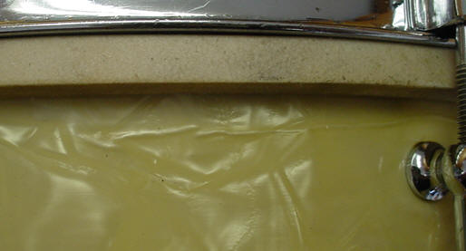 As the photos show, the WMP was bubbled in a few areas, fortunately at the back of the drum and away from the badge. I'm not sure what caused this but most likely it was caused by trying to fit an ill-fitting batter head or the glue in those areas just weakened via bad weather/exposure or simply just not enough glue in the area when it left the factory. Enter Al Schneider (The Original Drum Doctor) to the rescue. Al was able to employ the very risky "hot iron and dry cloth technique" to the shell. I trust Al with this type of repair but I always like to "remind" him that he is working on a very expensive and rare snare drum; nothing like adding a little more pressure to the situation. I am very happy with the outcome as the only other way to repair the areas would have been to completely remove the WMP wrap/badge/grommet and hope that the wrap comes off in one piece and that you could realign the wrap to match the hole patterns. The WMP pearl cleaned up and polished up nicely after the repair to the WMP wrap. There was a small divot in the panel left of the badge but a dollop of white pearl nail polish cleaned it up decently. The white interior was pretty dirty and cleaned up as best as could be expected. The L&L oval badge is clean with a tight grommet.