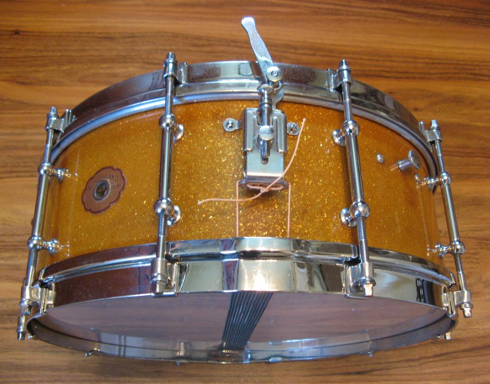 I just finished this restoration and thought I'd post a few photos. The drum has a solid maple shell, nickel hardware, HR Todd muffler and nickel hardware. The gold finish is way nicer than most I have encountered. Sparkling Gold was rather unstable and was prone to spotting, freckling, and splitting. This example has a few areas that are slightly darker. This is a non- Tone Flange model.
