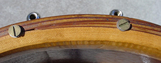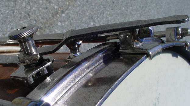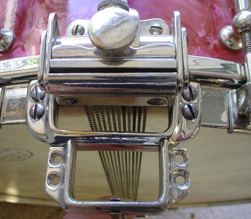 The 8x14 shell is walnut and very clean so all that was needed was some lemon oil to clean and polish the walnut...but...I think that this shell is a 3-ply shell which would be a first for me as far as DuAll shells go. Every DuAll that I own or have seen has a solid shell. Was Slingerland not able to steam bend an 8" solid shell? Check out the photo and see what you think. The hardware, ah...the hardware...18 lugs of pure weirdness. Our friend and fellow collector Harry Cangany saw this drum and emailed the following: "Mike: I saw that 18 lug DuAll last night and laughed in astonishment--some formerly valuable 10 lugger got in the hands of a mad man who drilled it for 8 more lugs.....let's look at the inside of the shell on that one!" So the questions are: 1. is this all original?... 2. is this an un-cataloged, one-off, special order? or... 3. "some formerly valuable 10 lugger got in the hands of a mad man who drilled it for 8 more lugs"? First off I looked inside the shell to see if there were any signs of a former "mad man" being there. I am happy to report (and mildly relieved) that the drilling for the 18 lugs looks all original and uniform. To confirm this further I lined up a 10 lug Artist Model and noticed that the 10 lugs on the Artist Model did not line up with any 10 of the lugs on this drum so more proof that this was an original factory drilling. The cloud badge is perfectly centered between two of the 18 lugs so this could not have happened if this drum had started out as a 10 lug drum. I took a look at the 10 lug Artist Model and imagined what another 8 lugs would look like but in order to even things out the shell would have had to be drilled for 20 lugs. Further proof are the 18 brass wood screws that are drilled into the top bearing edge that are perfectly aligned with every tube lug. Finally, you will notice that the snare gates on the bottom rim of this drum have a smaller opening, 1 3/8" and a 2" center to center hole spacing as compared to a 2" opening and 2 1/2" center to center on all of my 5x14 and 6.5x14 10 lug DuAlls. I see this as a factory modification in order to accommodate 18 lugs evenly across the rims. In conclusion, my vote is that this is an original factory-drilled shell. The tube lugs measure 5" end to end with a center to center hole spacing of 4.5". This is in comparison to a 6.5 x14 Slingerland shell that has tube lugs that are 4" end to end and 3.5" center to center. This drum has all original nickel plated hardware that is in great shape but really dirty and needed a thorough cleaning and polishing. Everything cleaned and polished up nicely. The DuAll mechanism works fine and the snare wires are intact. An interesting modification that I noticed was that the extension lever had to be bent/angled in order to clear the extra long tube lug. There was no batter head (tell me something that I already didn't know) but I went to my stash and found a nice batter head that fit perfectly onto the Tone Flange. There was no bottom (slunk) head either but that was an easy fix. There you have it, right out of the WTF? files. Now all that I need are 4x14, 5x14 and 6.5x14 18 lug DuAlls to make this a full set...(enter Forum readers falling to the floor in hysterics).