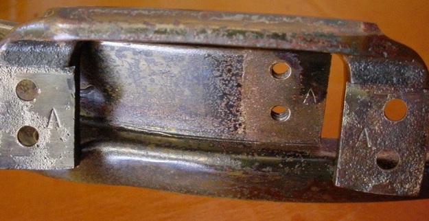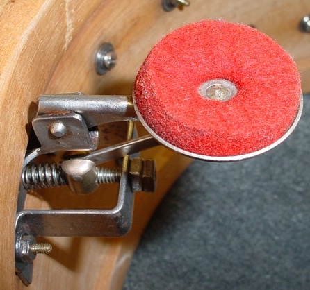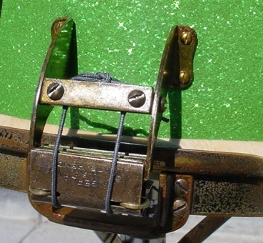 I'll call it Slingerland Artgold but the hardware finish on this snare drum really resembles the Ludwig & Ludwig Classic Gold (brass plating with gold lacquer) finish that L&L used on their early-mid 1930s Black Beauties. There was a lot of Artgold present but an equal amount of age and tarnish. I haven't figured out how to duplicate the Classic Gold finish yet so the decision was to leave the hardware as is and just do a simple cleaning with a light coat of gold lacquer to seal everything to prevent any further tarnishing. The 16 tension rods were not correct so I went to my stash and found the correct tension rods but these had to be brass plated, antiqued and lacquered. Thanks again to Les and Brian Hadnagy of Avenue Plating for the brass plating and antiquing. The threaded snare gates have the letter "A" stamped on the inside (not seen) part of the rim and gates. This is called a "manufacturer's cartouche", thanks to Slingerland expert Dr. Carl Wenk for that information. I'd love to know if those type of markings are under the riveted snare gates, feel free to send photos. The Slingerland Broadcaster engraving on the top rim is pretty faint but it is there. All in all, the "carpet matches the curtains" pretty well on this drum.