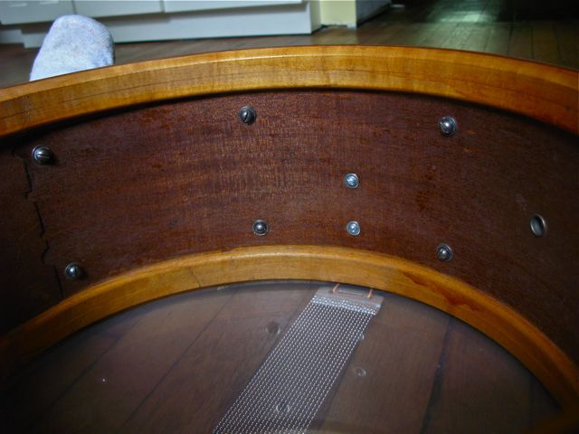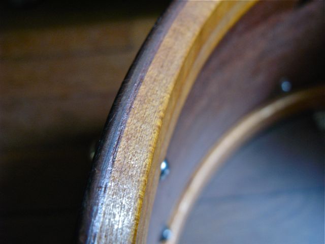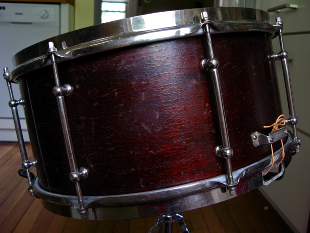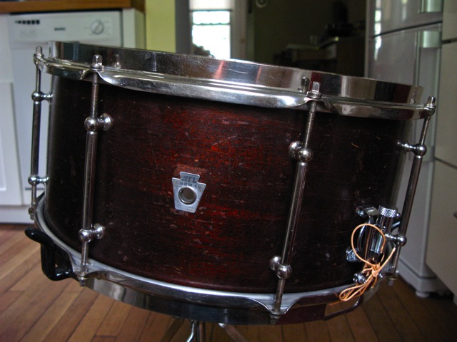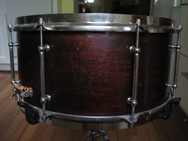 I have this drum that I am selling and I don't really feel that I have enough information to list this properly. I found what I think is the right model in the Rob Cook Ludwig book. So, I believe this is a 1938 WFL" Double Flanged Swingster". It's a 7"X15" Mahogany shell. It has a silver WFL Drum Co. badge and on the bottom of the badge it reads, William F Ludwig "President". One of the most important questions I have.... is this a one ply drum ? It's difficult for me to tell. Most of the later one ply drums that I own are much heavier in weight. To me this looks like it's one ply. I have included some photos. There is no re-ring separation and the drum to my amazement is in round. The bearing edges are in great condition too. The only draw back is I do not have the correct strainer for the drum. I did retrofit a new Ludwig Pioneer strainer to the drum which did not require any extra holes to install. There are no mods...... The butt plate says " Pat Pend" which is a little confusing due to the fact that I thought from 1917 onward the butt plates had the WFL stamp on it. The exterior is in good shape too. It has some wear , but nothing you would not expect from a drum of this age. Any help, info and approximate value would be greatly appreciated.