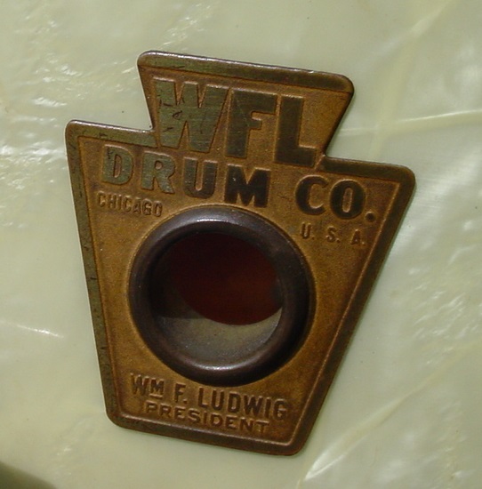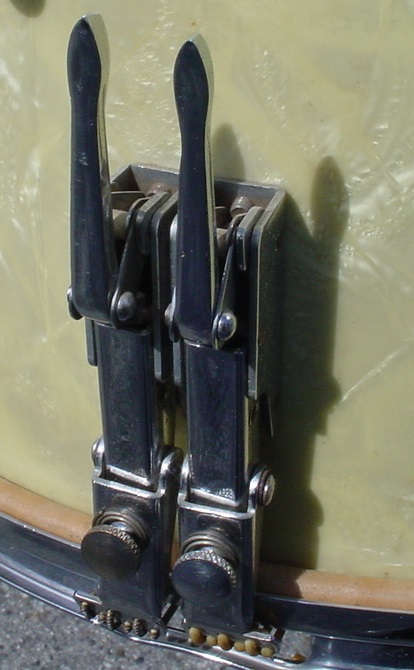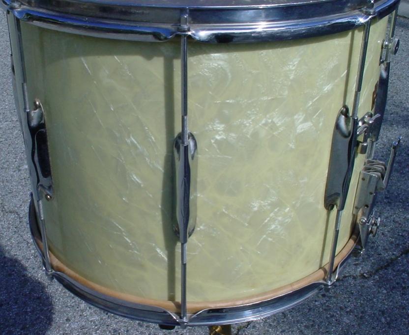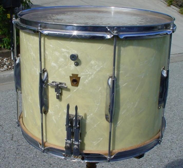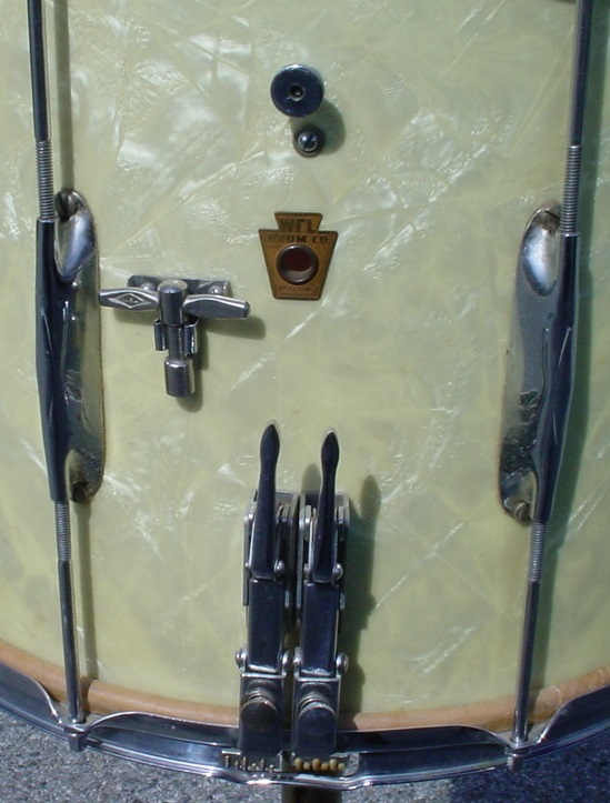The quest for rare, one-off, special order Street/Parade drums continues. This latest small condominium comes from Bill Wanser and Olympic Drums & Percussion, Portland Oregon. Thanks goes to Bill who allowed me to print the story that was in the item description. “Notes: This is a beautiful and rare WFL Twin Strainer concert field drum in original White Marine Pearl wrap. These drums were designed with two independently controlled sets of snares as described in the 1941 catalog displayed above. This design allows the player to switch between the two types of snares in an instant. All parts are original, including the drum key, and in excellent condition. The white marine pearl wrap is also in excellent condition with the only blemish being a small cigarette burn next to one of the lugs. This was caused no doubt by a relaxing drummer called to action on short notice and placing his still burning cigarette behind the tension rod. The snares are original gut and wire wound silk. The calf heads are newly tucked heads on the original flesh hoops. All chrome plated hardware is in excellent condition. This drum was used by the original owner in the Arizona State University marching band in the 1930’s. It then lived in a closet until the mid 1990’s when it was found and used in the Phoenix Symphony. An excellent sounding concert field drum that will also make an attractive addition to any collection.”