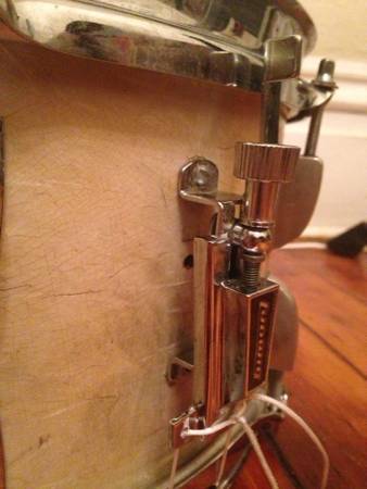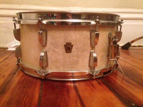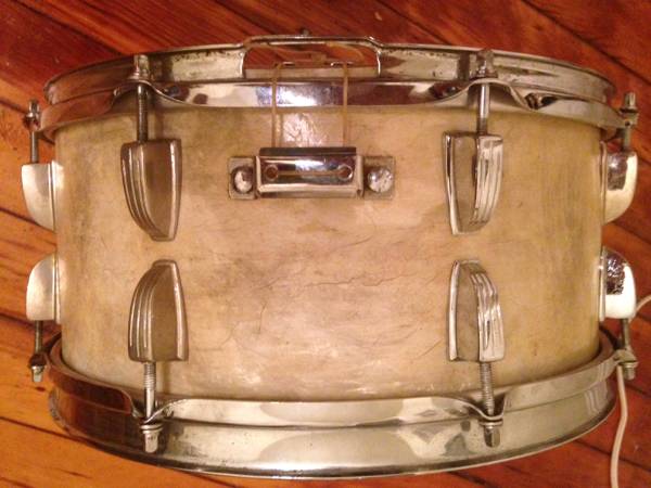 This is a pretty rad drum. Mid fifties Ray McKinley snare in white marine pearl. The wrap is yellowed and old and is more of a cream color now, but all the important parts of this drum are intact. Bearing edges and re-rings are in good shape. I also believe these hoops are COB. Some of lugs aren't as shiny as others and there's a small hole under the strainer. Other than needing another screw to hold the strainer in place, this drum is good to go. Please message me with questions. $225 shipped