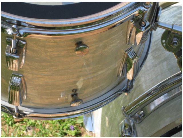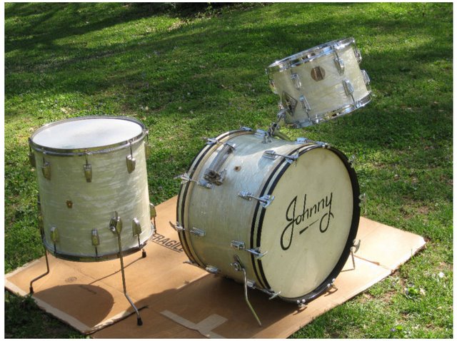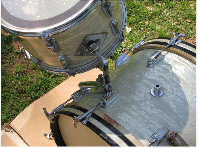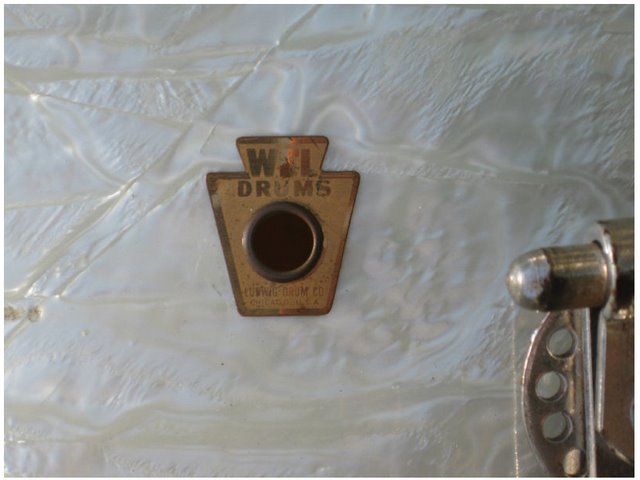 It says, Chrome hardware is pristine, free of pitting. Finish is super white super clean and free of marks or scuffs. Interior date stamped Oct 15 1957, matching 9 X 13 tom with twin factory tone controls top and bottom, clip mount as well as factory installed circular concert mount, 16 X 16 Floor tom pretrial number Ludwig badge nickel hardware, brass hoops all correct tension rods, Ludwig batter and resonant heads, white interior date stamped Aug 14, 1961. All hardware original clean and correct.