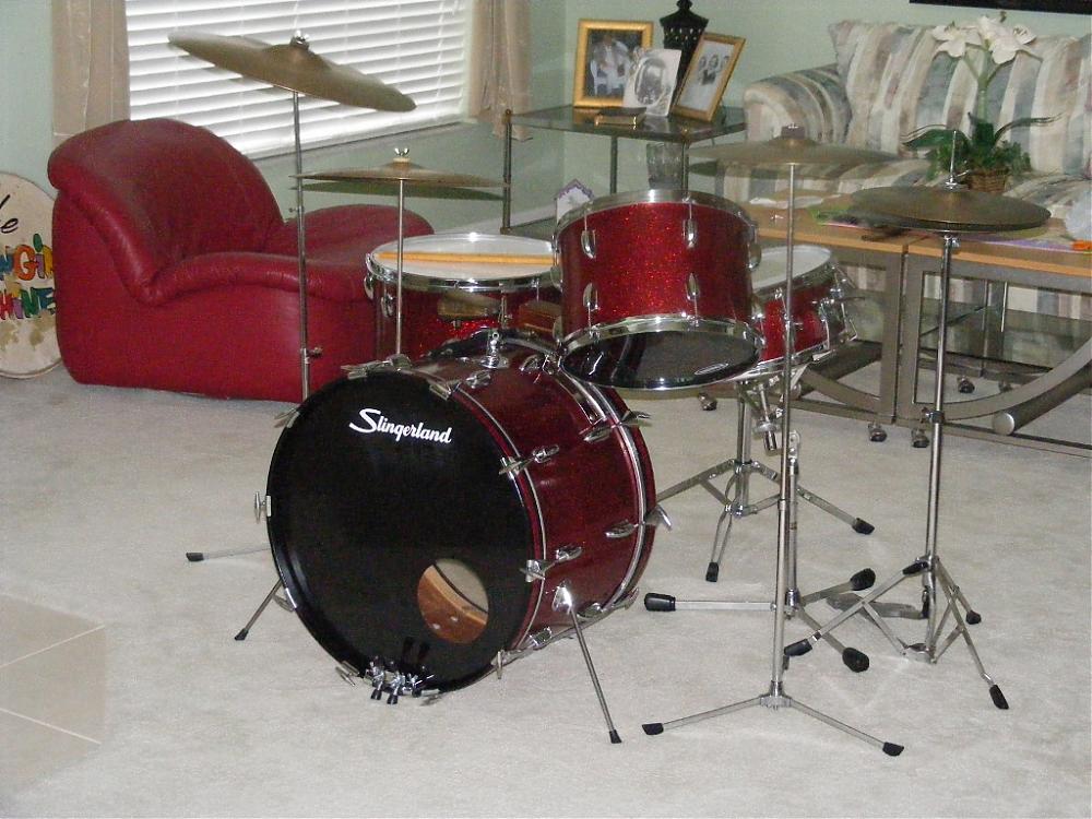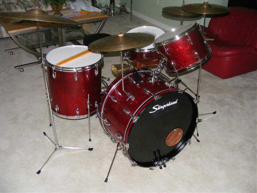 This is my 1959 Slingerland Radio King Set...purchased used in 1963. They were "on loan" for over 25 years and recently retrieved...the picture you see is after a thorough cleaning, where I took them down to the wrap which is still perfectly intact...simply cleaned the wrap with a damp sponge and used chrome polish on the hardware and reassembled. I did strip and repaint the BD hoops, and replaced the inlays. It's a testament to how good quality lasts.