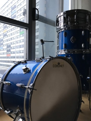 1960's Coronet 4 Piece Kit in a blue sparkle wrap with a chrome snare. Drums are all original! They look and sound very nice. Equipped with Remo Silent Stroke heads.