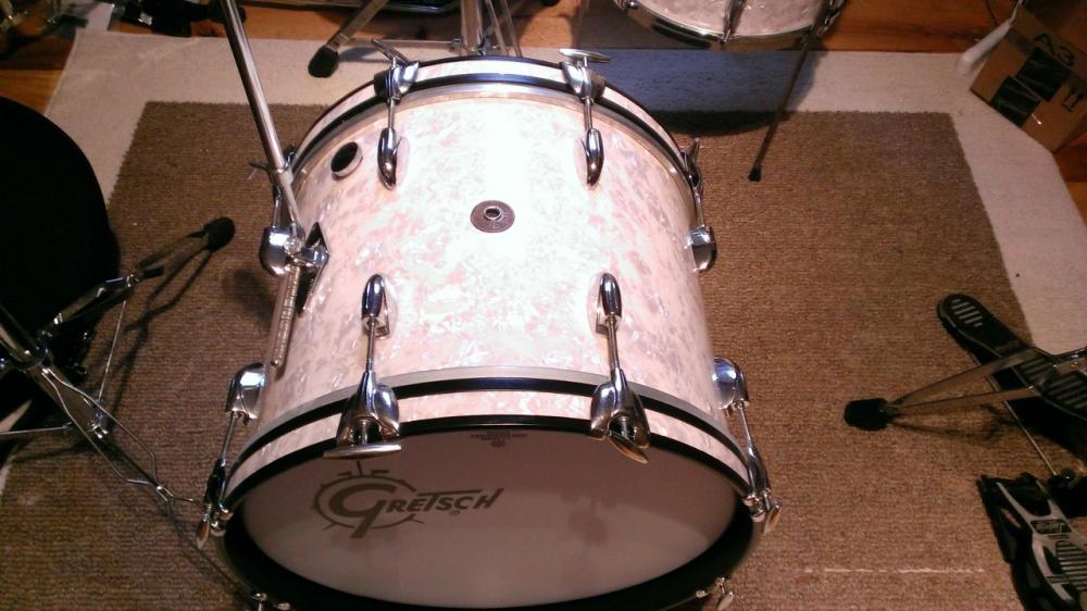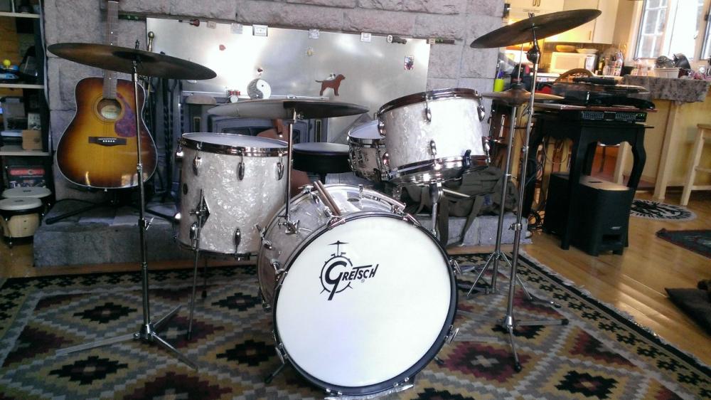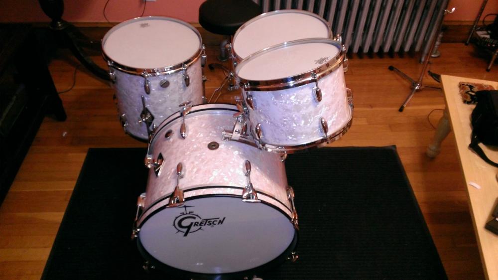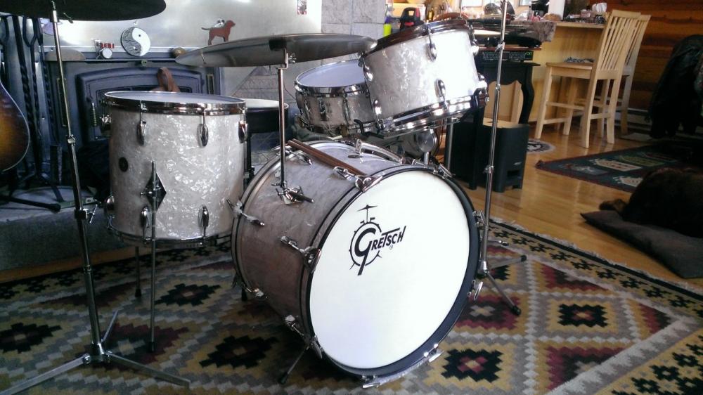 Excellent condition and sounds amazing! All drums recently rewrapped in white pearl to match the WMP Gretsch that Max Roach played. Bass drum hoops have been repainted. All edges have been trued. (This makes a HUGE difference in tone and tuning.)