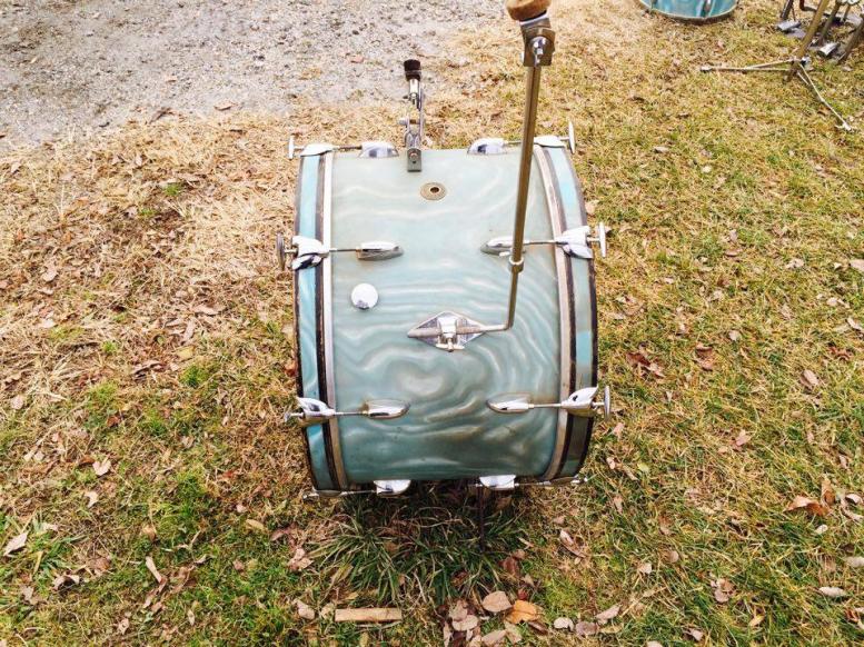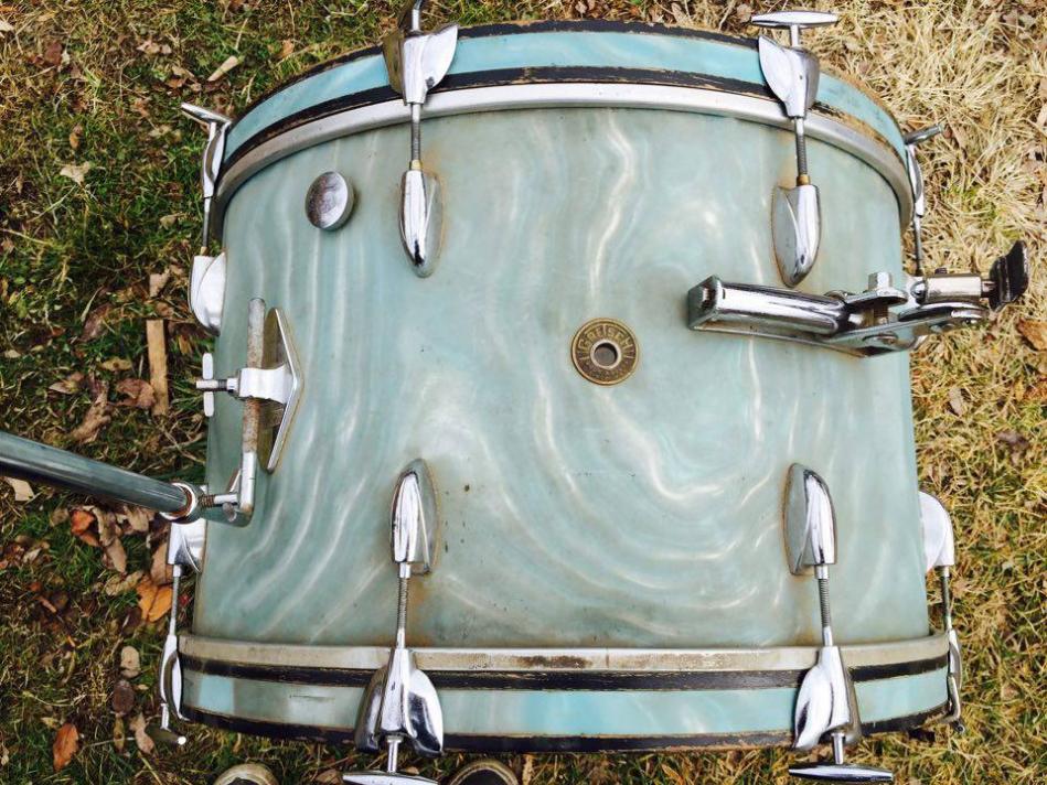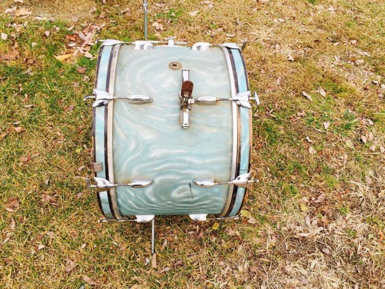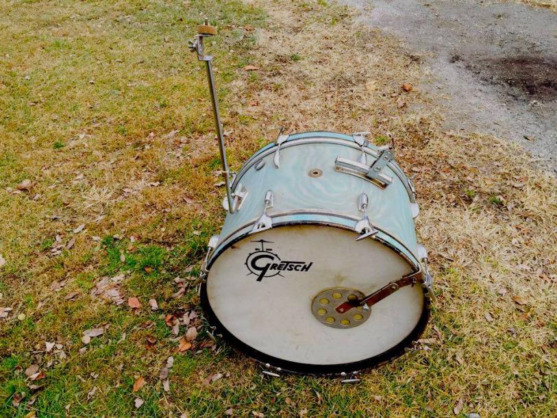 1960s Gretsch Round Badge 14" x 22" bass drum in Aqua Satin Flame wrap!