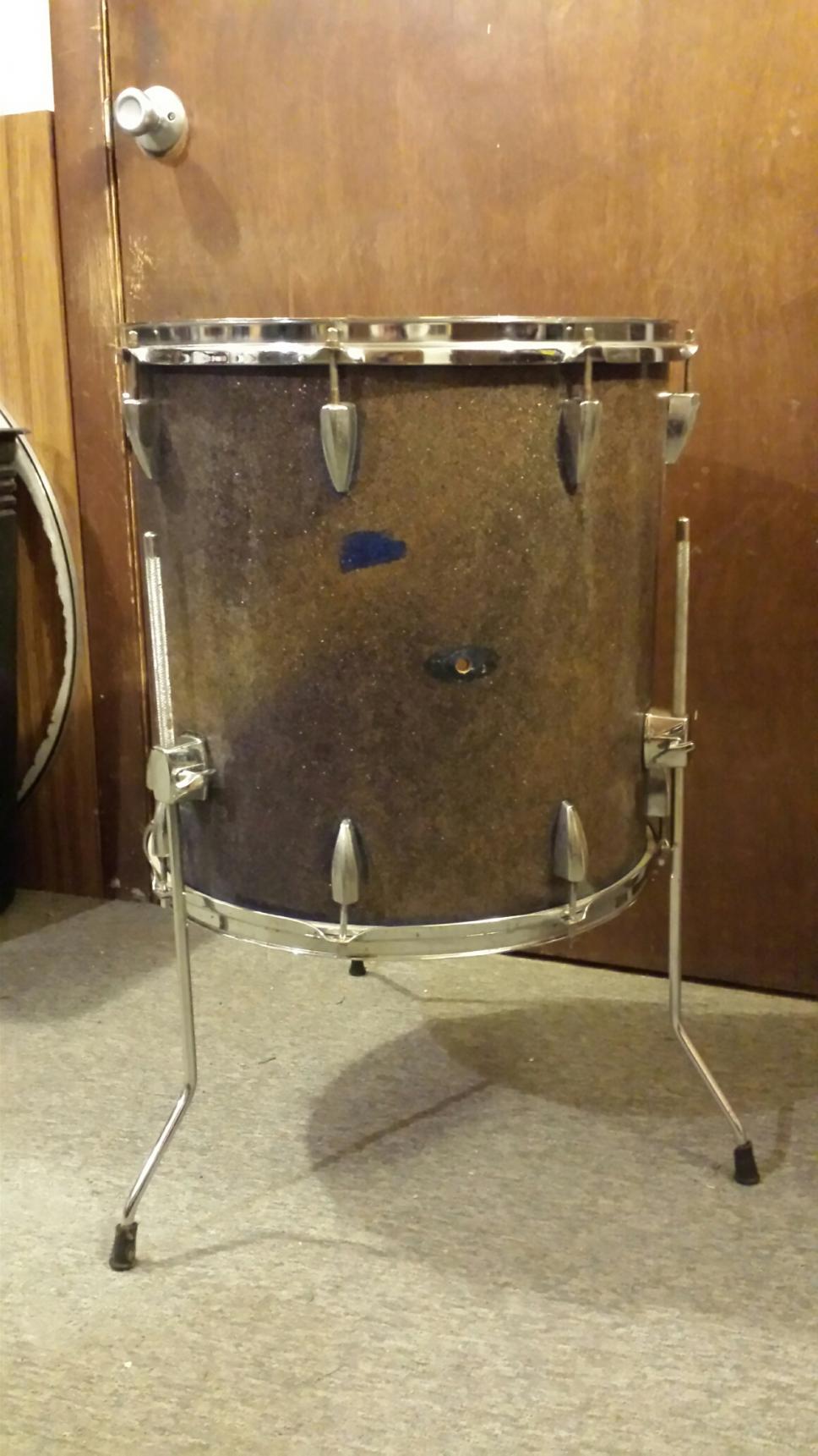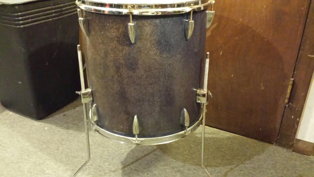 Have a 1960's MIJ ( Made In Japan ) 16" floor tom for sale. Blue sparkle which has faded through the years. Has original lugs,rims,tension rods, and internal tone control. I put Pearl Forum leg brackets on. The original ones were cracked and missing the wing screws. These fit in the holes that were already there. There are no cracks warps or bubbles in the wrap, and the shell is sound. Heads are playable and this drum has a deep rich tone.