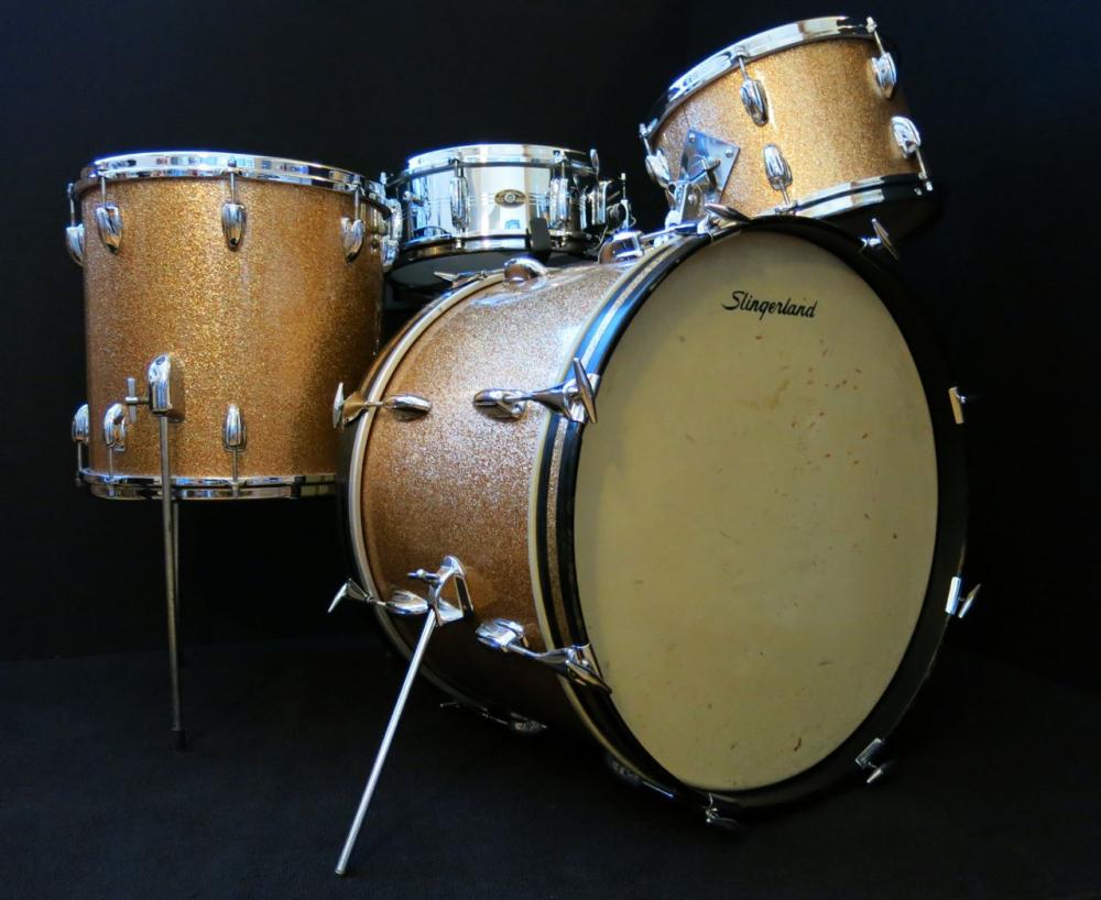 Here is a drop dead gorgeous 1963-1965 Slingerland "Modern Jazz" Drum Kit in original Champagne Sparkle Finish. The drums are 20x14, 14x14, 12x8, and a 14x5 Sound King Snare drum in fantastic condition!