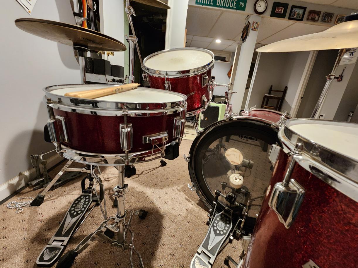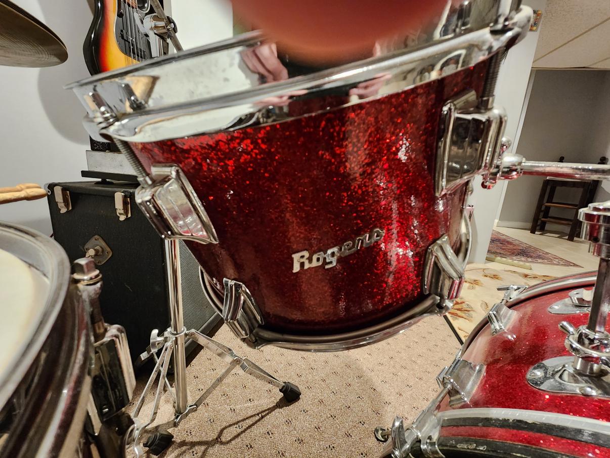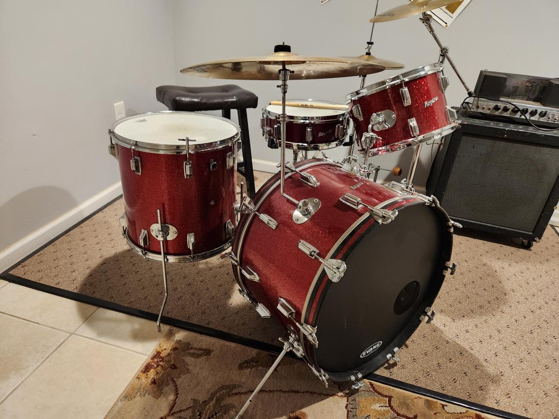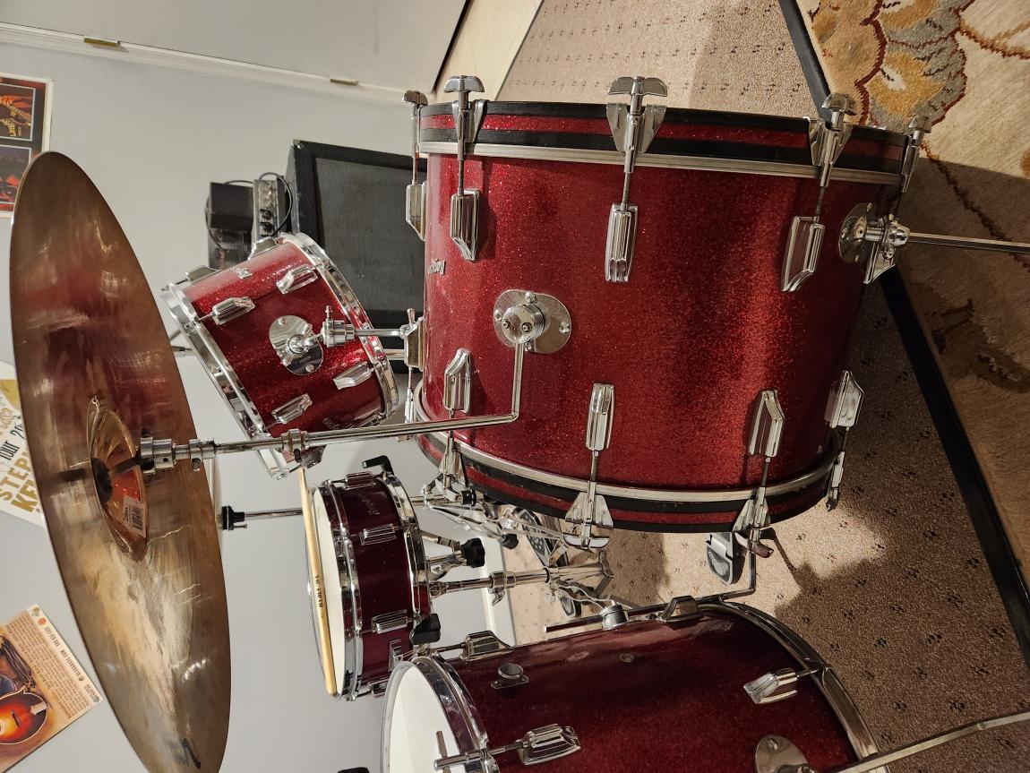 22" bass drum, 13" rack tom and 16" floor tom date from 1970/1971. Rarer red 14" sparkle matching snare dates to 1965.