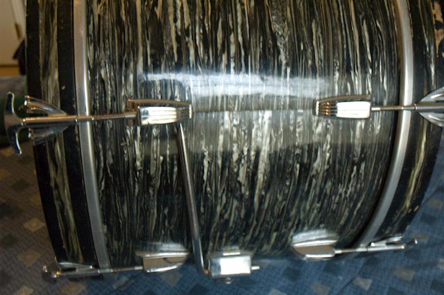 They are white inside and stamped Sept 20, 1962 and the badges have no serial #. They also have the red baseball bat mufflers and the original wires on the snare. The "kicker" was finding the trusty Speed King pedal and my tuning key and wrench for the rail system along with my old stick bag.