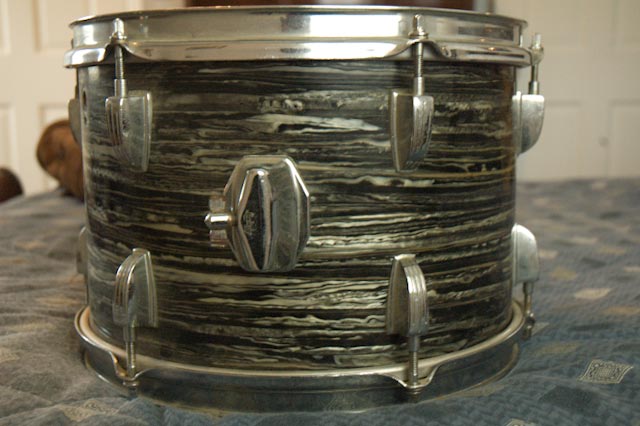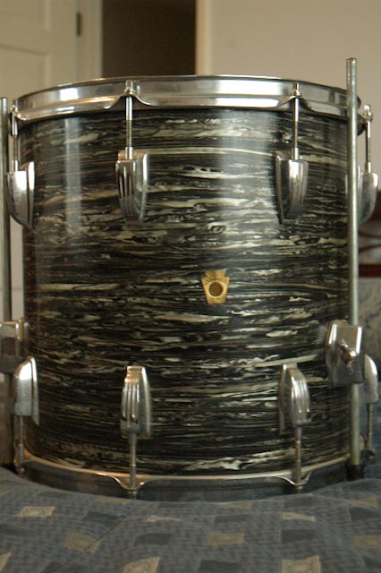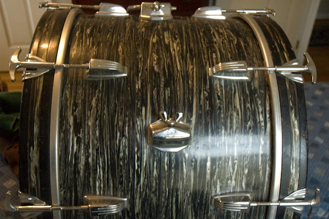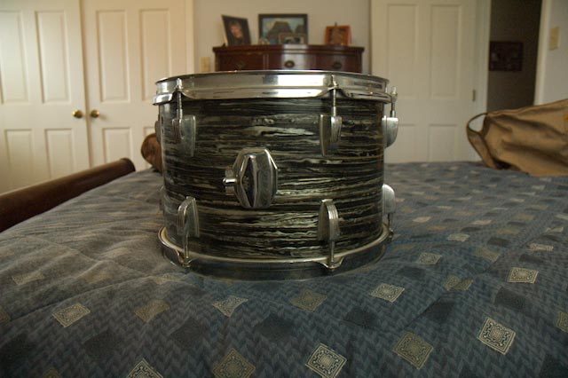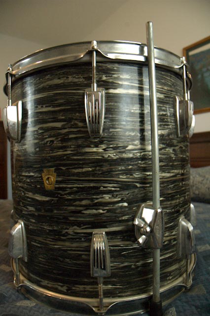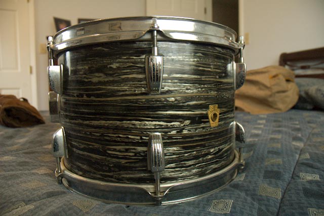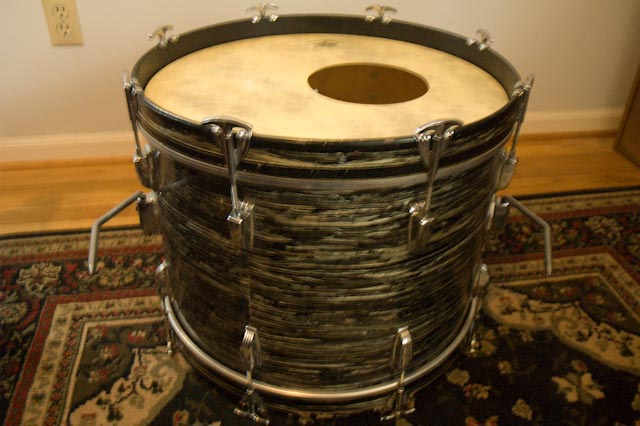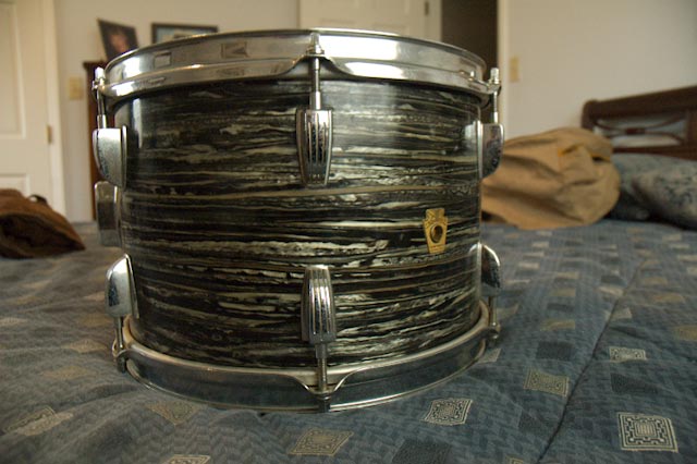 Digging through the closet and came across my Oyster Black Pearl 1962 Ludwig Downbeat set. I was really surprised to see them after many, many years. But there they were, 20x14 kick, 12x8 tom, 14x14 floor tom and the matching, 8 lug 14x4 snare.