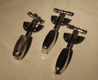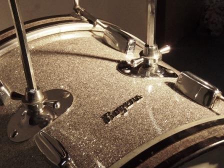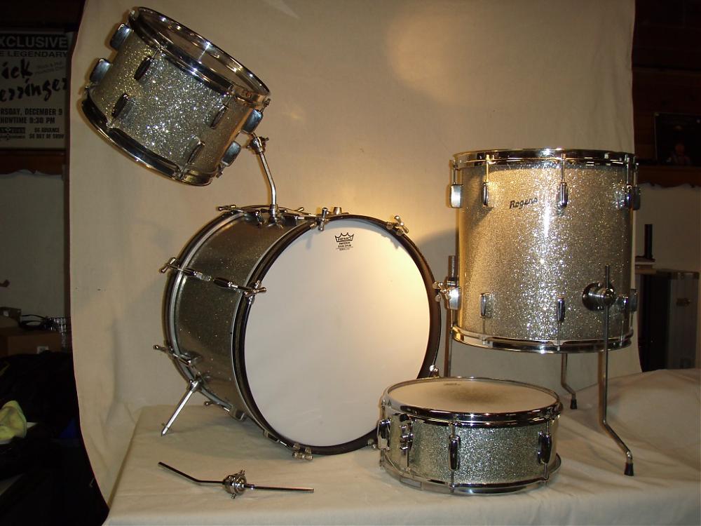 Set of bass, floor tom and tom plus matching snare. Cleveland labels with consecutive serial numbers – 33376, 33377 and 33378. This places them in 1963. Finish is Sparkling Silver Pearl with no damage or fading except small patch along seam on floor tom. All seams are flush. Interiors are flat gray. Chrome is excellent. All drums have both hoops and all lugs. The hoops are nice and round with no dings. I have not cleaned these thoroughly because I know some folks like to do it themselves. They are clean. I also have a set of Beato bags to keep the dust away.
