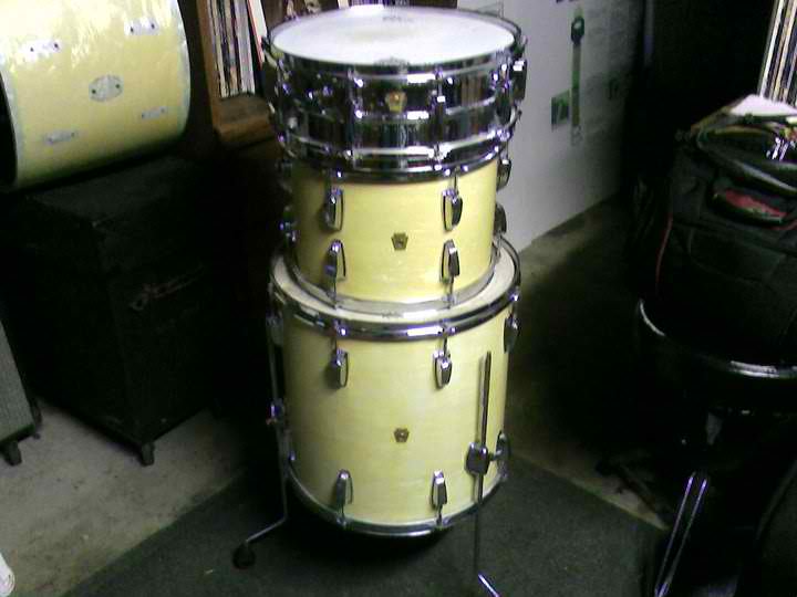 Ahh come on...everything else YOU OFFERED is either missing parts,with extra holes,pieced together,and needs restoration and a bath or refinishing...we are talking about a complete 1963 set that stayed a family all these years,22,13,16,snare,SUPERCLASSIC!!! complete w/NO extra holes,COB hoops,super-smoked-yellowed-white-marine-nicoteen-mother-of-pearlMind Blowi...Yes Sir...you want my gold...Excited...ok...but the trade has to be even...or NO DEAL...:D...OK,back to finish Kleening...just take a look at these puppies so far...Jumping2...YAHOO!!!