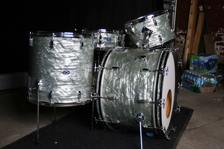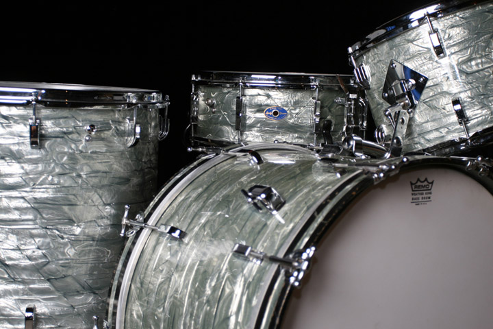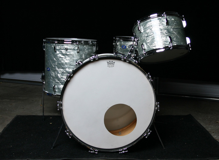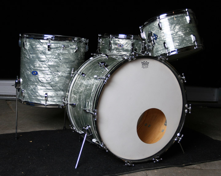 1964 Leedy / Slingerland 22/13/16 outfit w/a matching Shelly Manne Snare drum. Bearing edges are in great shape and help produce a beautiful, warm sound on this kit. All rims are COB and shines! There is a bit of rust on the strainer arm. The finish is a very clean and glossy Sky Blue Pearl over 3-ply shells w/reinforcing hoops. The wrap has faded slightly but is even on all drums. The seams are nice and tight with no lifting as indicated in the photos. The kit is all original, no extra holes and no issues. The bass drum hoops and inlays are original. The hoops show signs of minor wear and could be repainted but there are no major gouges or dents. The snare has new PureSound snare wires and I will include the originals as well. I will also include the original bass batter head, rack tom batter head, floor tom top and bottom heads and resonant snare head. Also, I will include a set of drum bags. These are up on FeeBay as well but open to offers. I'd much rather sell to fellow forum dwellers. If you have any questions or would like to see additional photos, let me know. Thanks everyone!