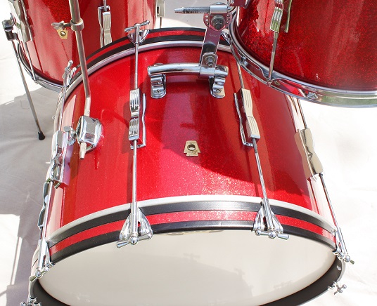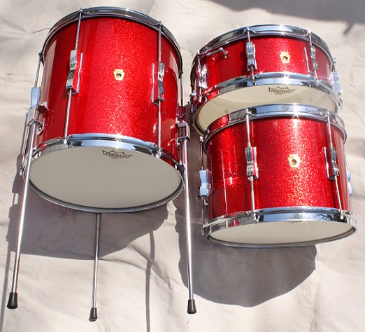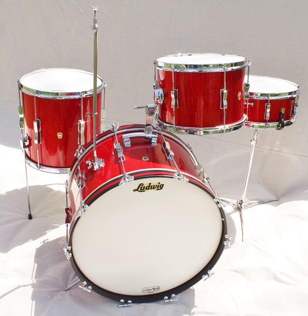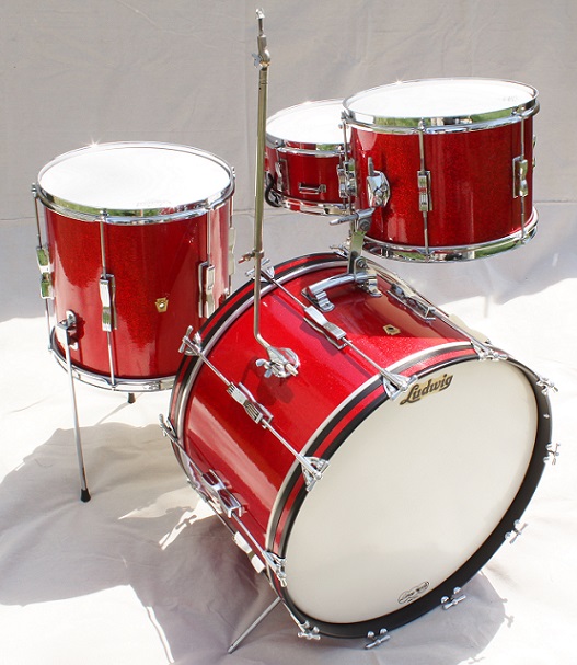 Up for sale is a beautiful, all original 1965 Ludwig Club Date drum set in original Red Sparkle wrap. These are 3 ply with reinforcement rings ( original white interior) and have red felt baseball bat style mufflers. Sizes include 13 x 9 tom, 14 x 14 floor tom and 14 x 22 bass drum. The matching snare drum is a 1964 5.5 x 14 Jazz Festival. All drums still have their original keystone badges and all original hardware. The bass drum still has it's original Logo resonant head and a nice Powerstroke 3 batter in fantastic condition! All other drums have new Remo Ambassador coated heads top and bottom. All chrome is in great shape with very minimal pitting.