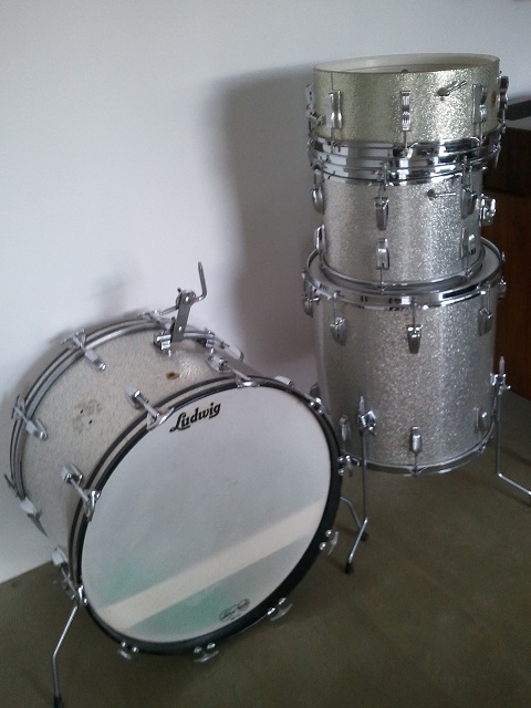 Great looking set! I would love to have that snare for my silver sparkle set.I am just wondering. Did the 60's Ludwigs have wing screws on the tom mounts or the hexagonal nuts that requred the tool? or those could be replacements. Looks like you need the bass drum cymbal mount but you can find one easy enough. Set looks well taken care of.
