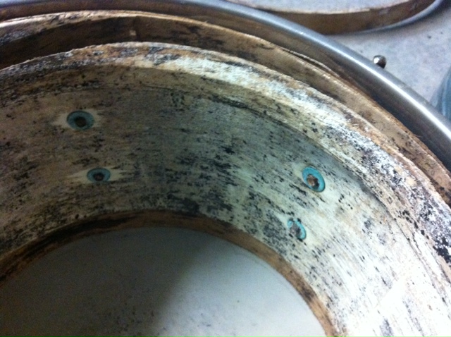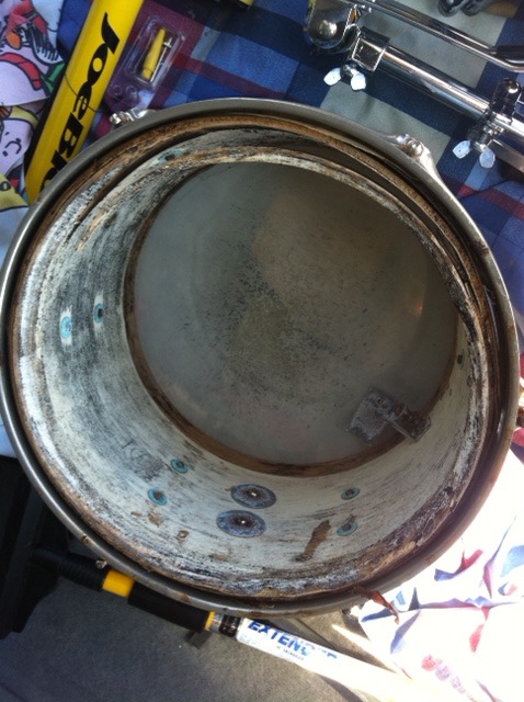 Alright, so as you may have seen I got a nice 1965 Jazzfest today in Blue Oyster. For some reason it escaped the zombie infection that these two drums got...and I am very thankful for that. Looks like these things were immersed in water and left to rot/mold for a long long time in a basement...but for some reason the blue oyster pearl covering is in just fantastic shape. Little to no fade...all intact. Looks like it was kept in an climate controlled studio.