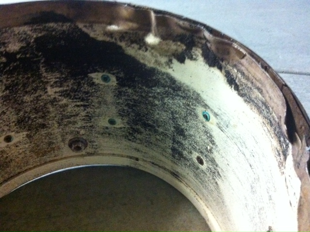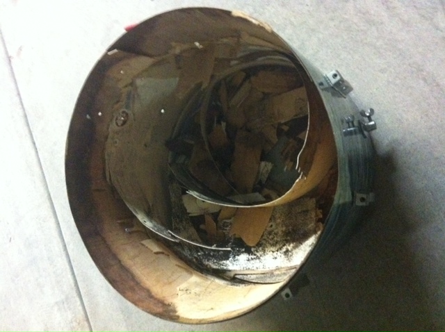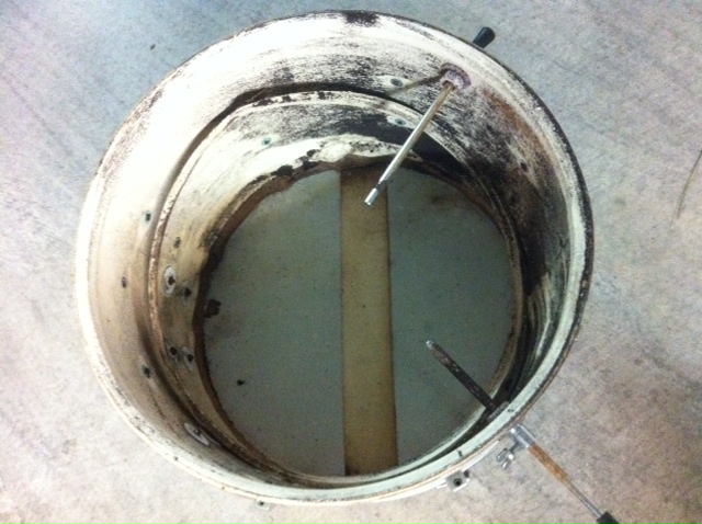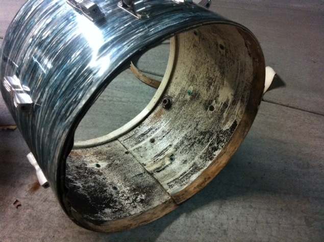 The actual shells on these two drums were so far beyond repair that the mold was literally giving me a HUGE headache as I drove back with them today. It was like a serious algae bloom was happening in my car. I didnt know how serious the zombie infection was at the time. I was planning on at least saving the bass drum to go with the snare and seeing what I could do to add some toms. After all, the bass drum wrap looked SUPER nice and the original heads looked like they had barely been hit! About 30 mins into the drive however, my headache was telling me that something was wrong. The fact that the (lead?) paint was peeling all over the place in the 12 inch tom made me fear the worst for the bass drum...and I was a little concerned about my respiratory health at that point.