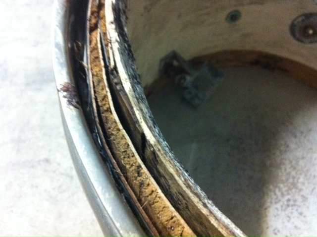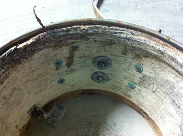 First are some pics of the drums when I got them. Original BD heads did a great job to conceal the horror that awaited inside, but as soon as I took off the front head I almost puked. This thing is like the night of the living dead! The wood was so rotted that the plies were just falling apart. One re-ring was just bouncing around loose inside. This is the kind of shell that has the wrap lapped into the seam of the shell and it was just hanging out at the ends inside. The hardware inside was all rusted to heck, but on the outside (of the bd atleast) there was no sign that anything was wrong. The T rods and claws have MINOR rust that can easily be taken off, and the lugs look great. The consolette looks great. The wrap is pristine! The bd leg mounts however are rusted on. Ill need to do something serious to get those things loose.
