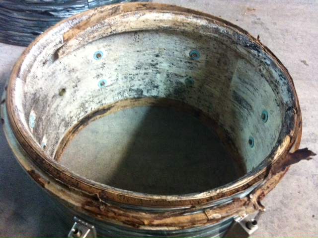 The rack tom looked like a losing battle from the beginning. It had one original head, but was missing one...so I could see that the drum was completely rotted out inside. Re-ring mostly separated, and plies falling apart. Bottom bearing edge just mutilated. The wrap however...again....VERY NICE! So weird! Both drums have original badges intact and in like new shape. As I took of the hoop that was holding on the remnant of a wooden flesh-hoop...the whole re-ring just fell off in a poof of mold.