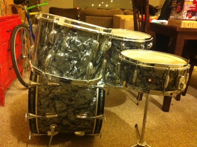 This also came with the correct strap drive pedal and flat base strap drive hi hat stand, a Beverly snare stand in really nice shape, and some garbage cymbals. If anyone reads this and needs a Beverly snare stand, PM me.