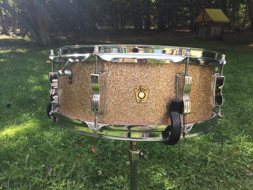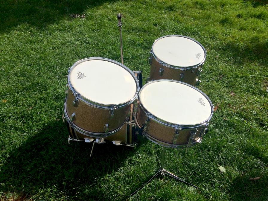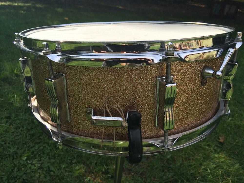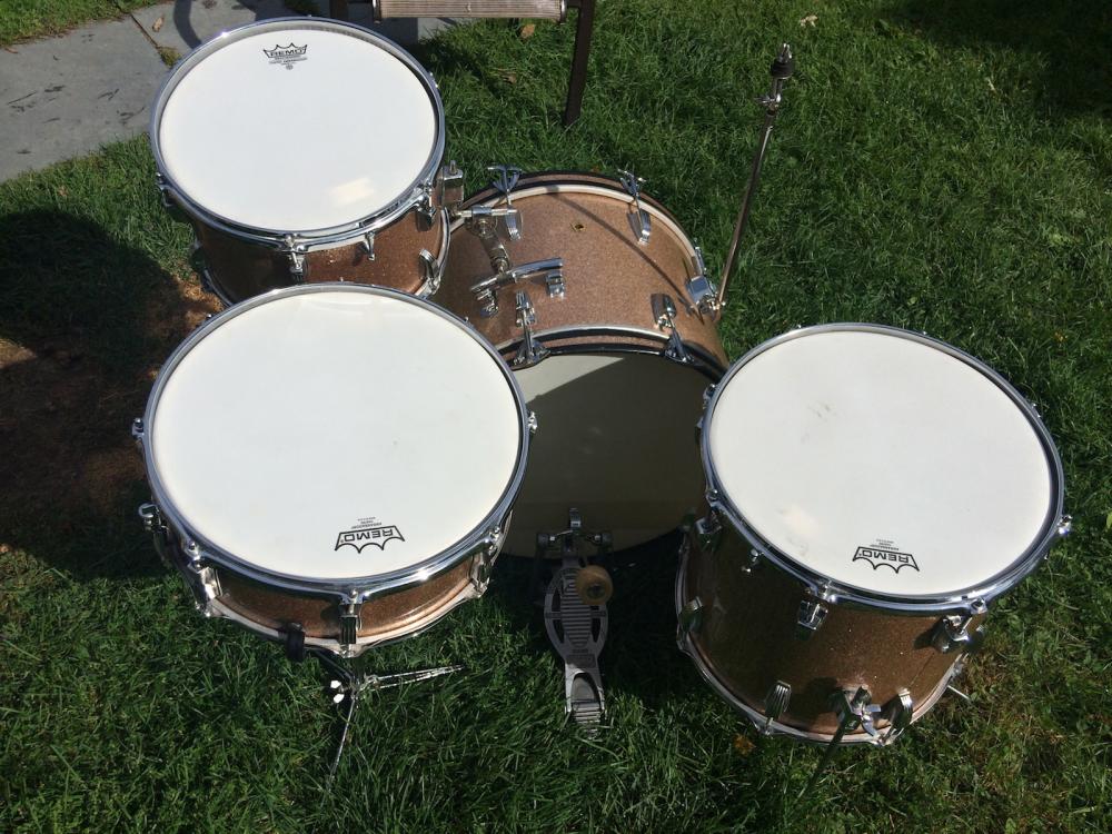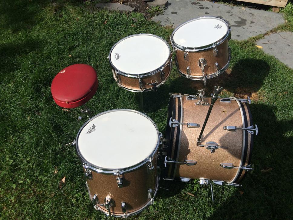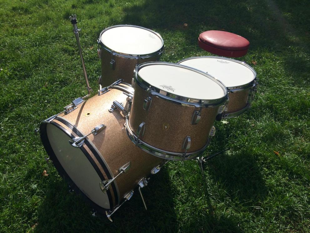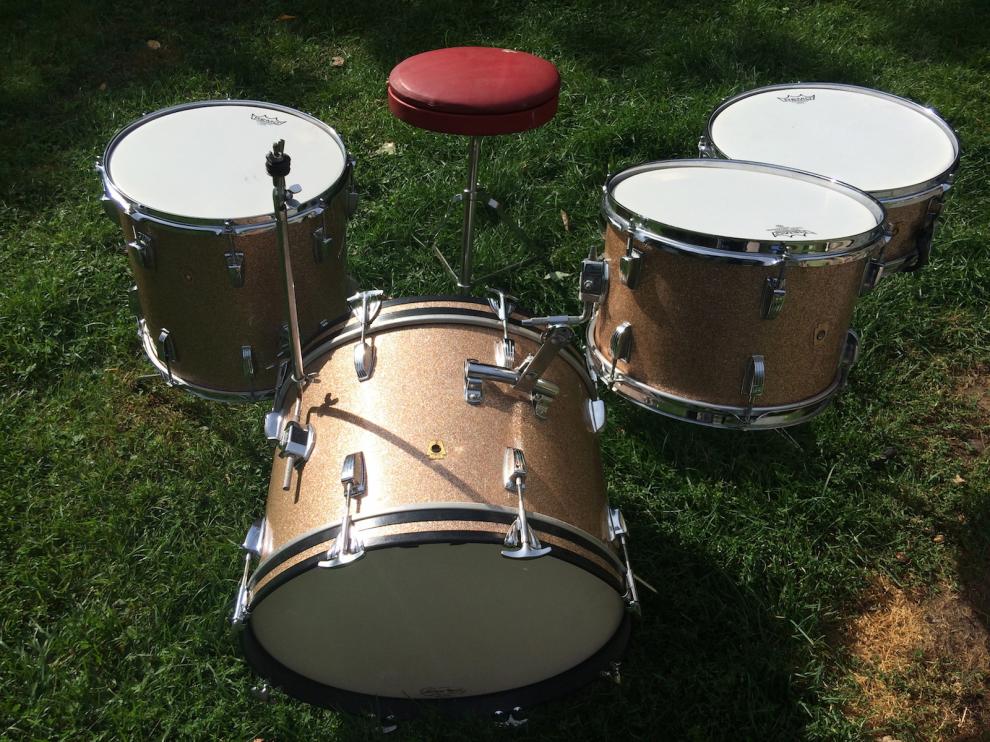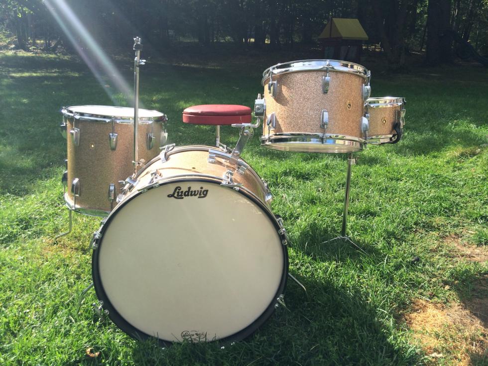 Vintage 1966 Ludwig ‘Downbeat’ Outfit, complete with factory matched Jazz Festival Snare Drum in original Champagne Sparkle wrap.