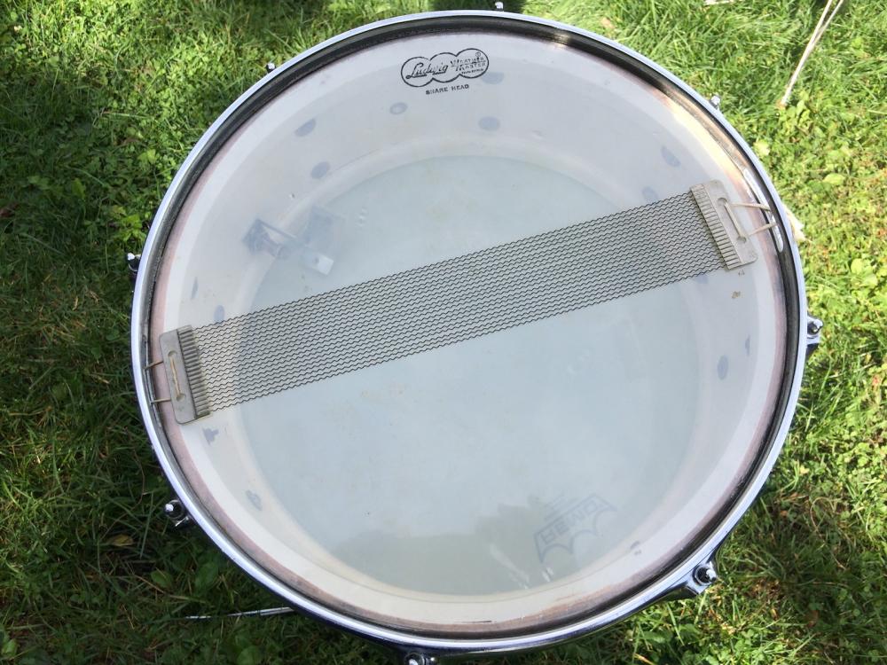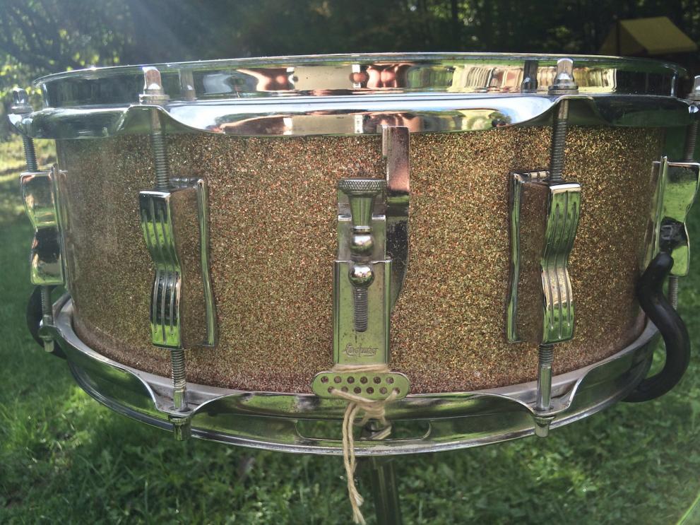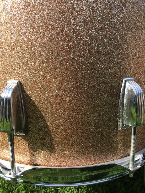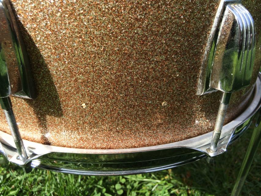 unfortunately it seems some fool back in the day thought it would be a good idea to try and turn the 14” floor tom into a snare! (sigh…) It seems said fool had drilled very tiny holes to put a throw off and a butt plate on the drum. luckily he did not cut snare beds into the drum and eventually re thought the whole idea. the holes have been filled and are very very hard to even see, please view the pics. this pains me greatly as this kit would be a museum piece time capsule if it wasn’t for this moronic boob’s alteration. luckily, the holes are very tiny and hard to even photograph and are literally barely noticeable. i do have a small piece of original champagne sparkle to patch them but again they are so small it would be fairly difficult to even do.