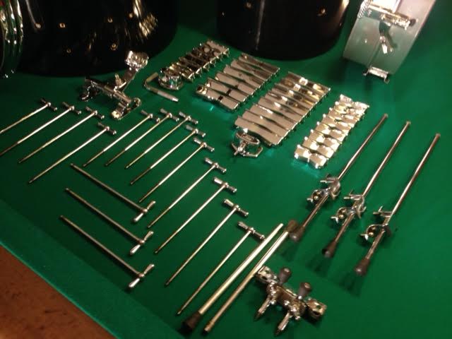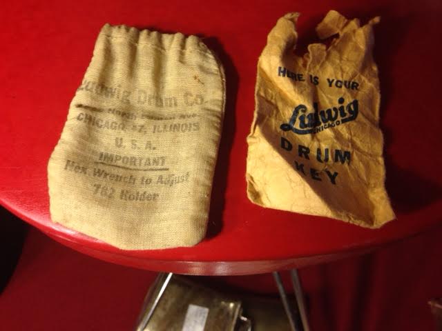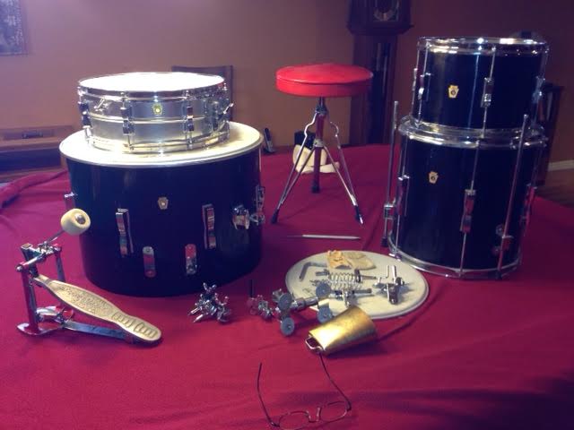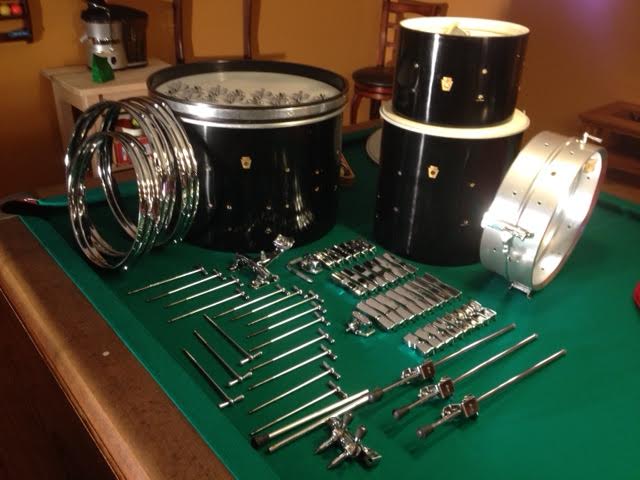 It included the original Paiste crash and hi-hats, spur-lock hi-hat stand, bass ride-cymbal stand, floor cymbal stand, (not pictured) Speed-Master pedal, wood block/cow bell holder, spring-design stick holder and brushes. The coolest part was the red vinyl stool. the only thing missing was one of the 20" hoops. I have found a replacement though.
