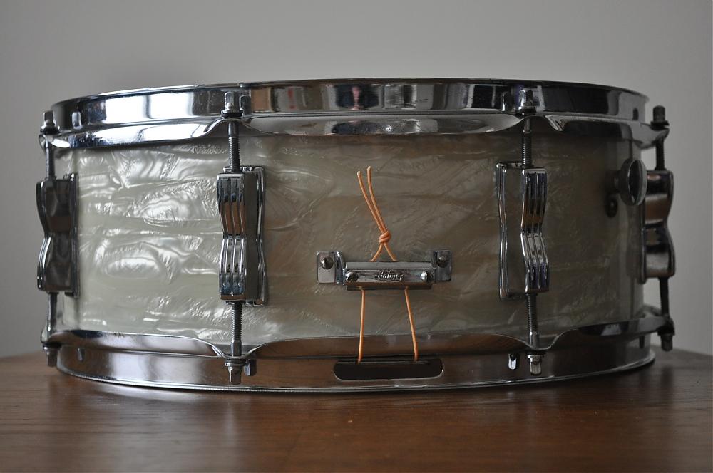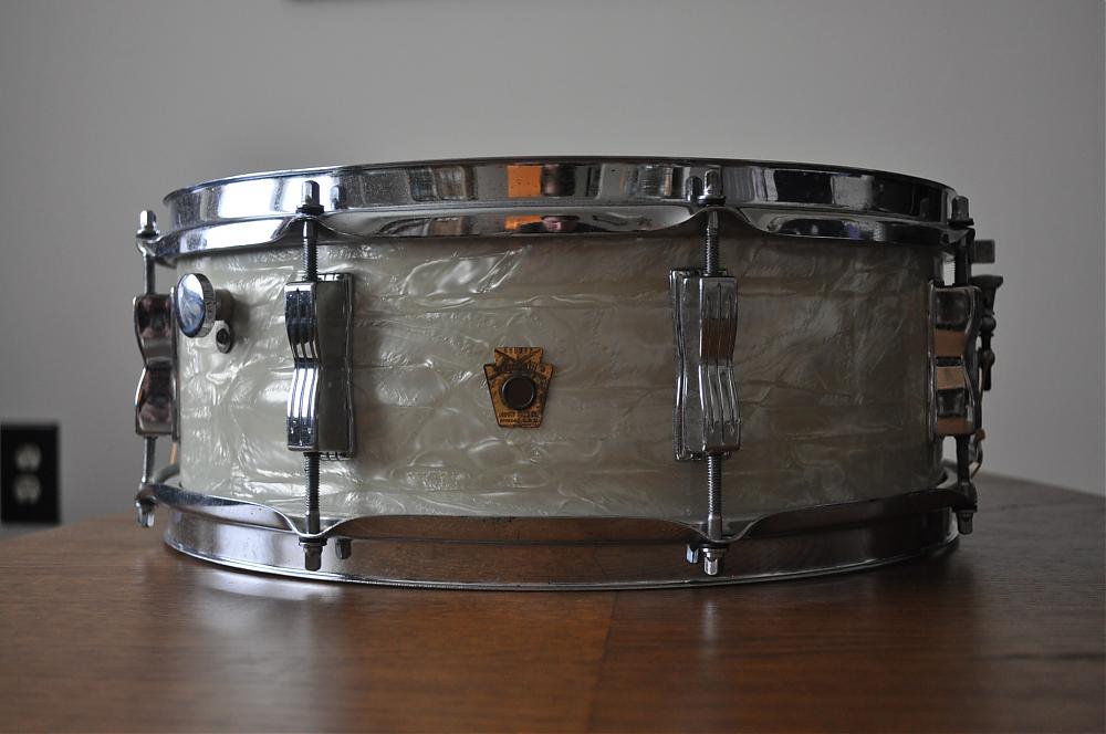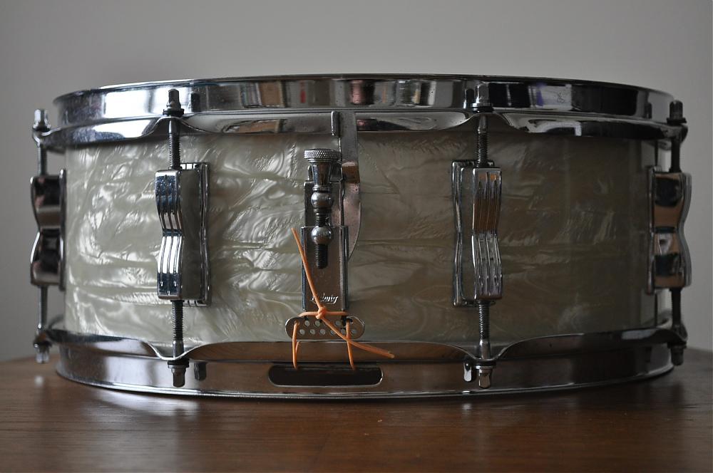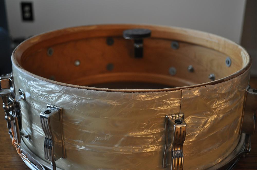 1969 Ludwig Jazz Festival in original White Marine Pearl.Wrap has aged to a minty crème color, though it appears more white in the photos. Keystone badge has serial number 685372. Original Ludwig script snare wires and ‘60s Ludwig bottom head are included. Clear maple interiors are beautiful. There is no date stamp. Chrome is decent with average pitting; the hoops have some additional wear. No extra holes, modifications, or other issues. This drum sounds amazing!