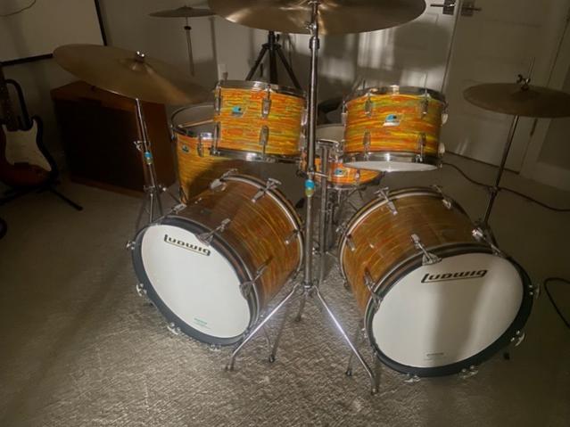 This is my "new" Ludwig 1970/1 Rock Duo in glorious Citrus Mod! 12-13-16-20-20 5X14? The cool thing about the set is that it has 2 virgin 20" bass drums.