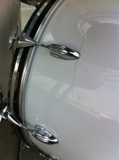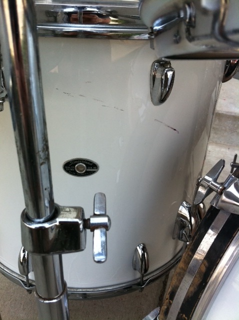 All mufflers are present and working. Bass drum has "double spurs". All 4 have their rubber tips. Floor tom has all 4 original legs and they all have their rubber tips. All toms have original Slingerland heads top AND bottom and they sound like they came right out of the 70s. Pretty cool. The insides of all of the drums are like new. Bearing edges are immaculate. Each shell is stamped "Slingerland" on the inside. Bass drum has minor re-ring separation in one spot (shown in picture). Could easily be glued and clamped if it bothers you. Minor bumps and bruises here and there on the finish. Bass drum has two minor splits on the side (also shown in pics). Not noticeable from a foot away. VERY minor pitting here and there on the chrome but overall a VERY nice looking set.