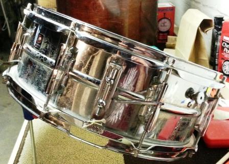It has a couple small dimples in the aluminum shell and has very little pitting. It looks like it was dropped at least once in it's lifetime, because the throw-off lever is bent, which reduces the travel when you engage the snares. If you give it a good rim shot, the lever disengages. As a quick temporary fix, I used a rubber band between the tension rod to the left and the throw-off arm. It's back at the school right now, so they can use it. Is this common with this type of Primier throw-off? Does anybody have an extra one that is for sale? I don't really want them to need a rubber band to make the drum function correctly.