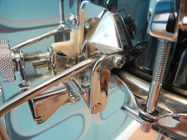 > a tiny bit of over tensioning will start to choke the drum= Super Sensitive! Get it? lolShe's a real beauty stedi, congrats on a great buy. It's a shame the previous owner reamed that hole to add a conventional screw on the strainer. I have several of those little Allen screws that hold the guard in place. I would have been happy to send you how ever many you needed to complete the drum.
