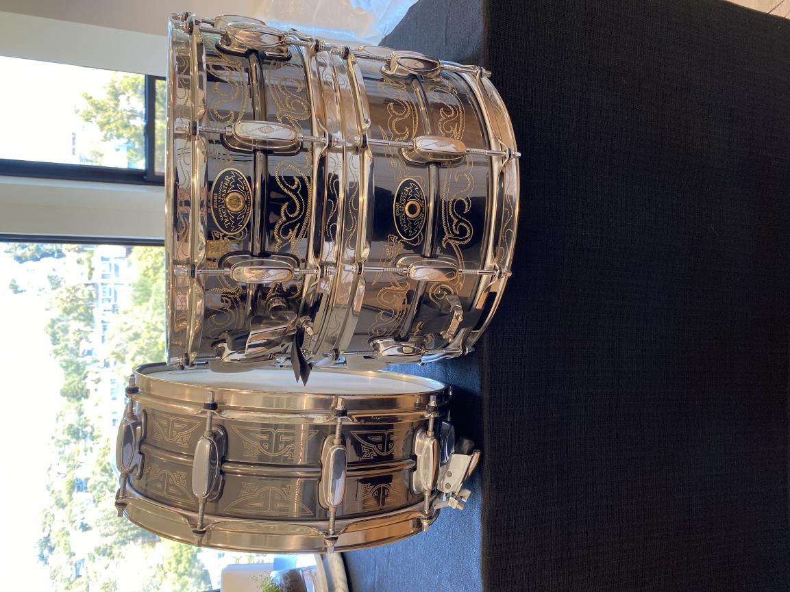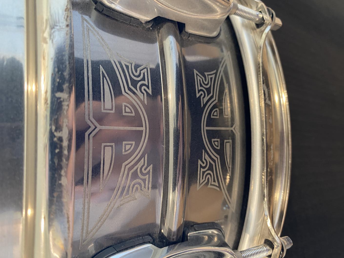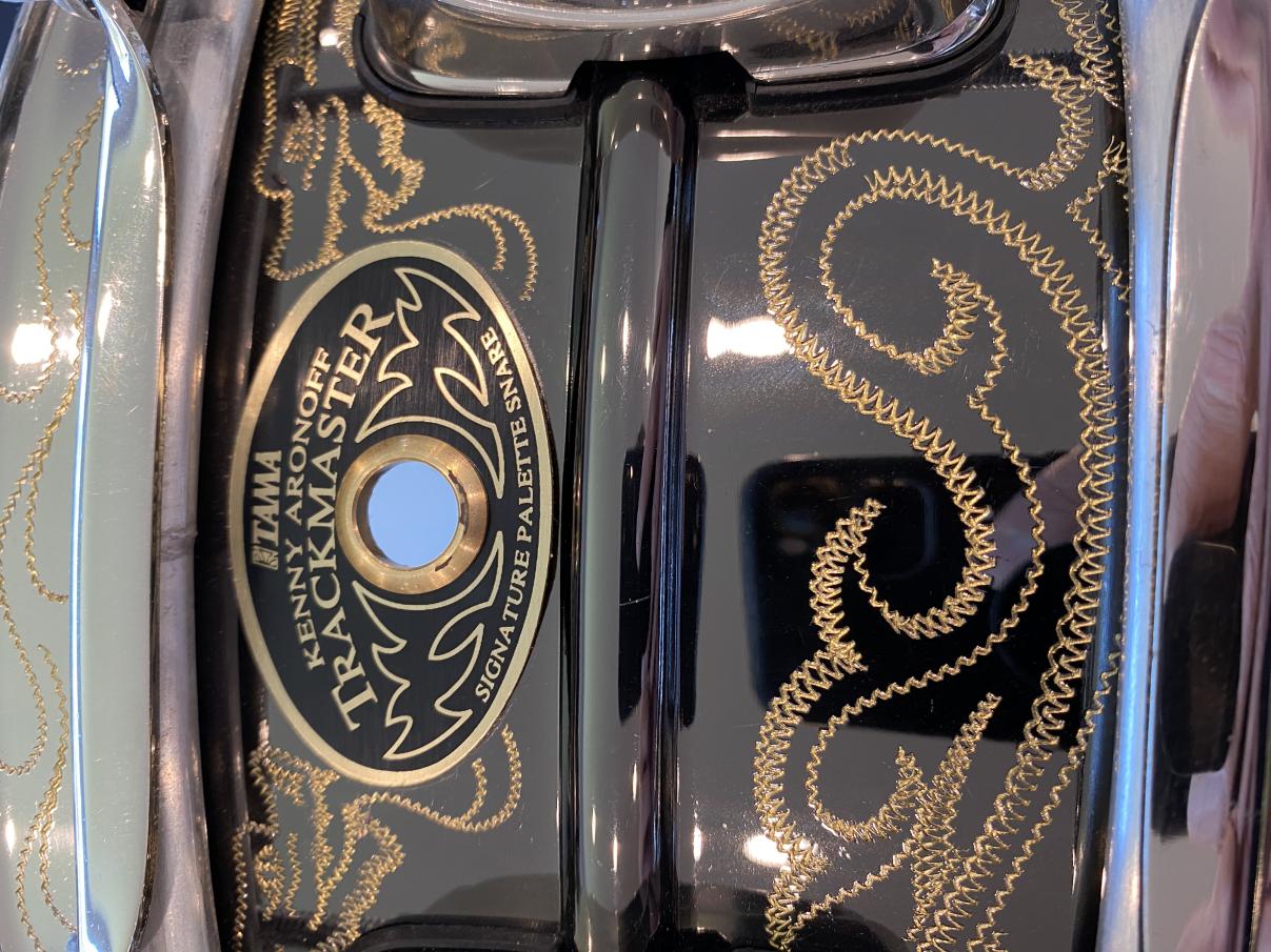 “This instrument is the same Kenny Aronoff Trackmaster Model as the previous one but in the 6.5 x 14 shell size. Only 30 of these snare drums were engraved/produced; this is #01 of 30 that were offered to the public. John Aldridge engraved these drums as well.”
