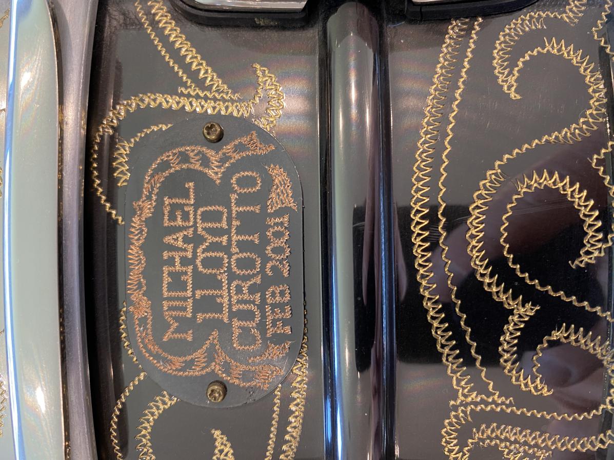 “When the Tama Drum Company approached Kenny Aronoff with the idea of a signature snare drum he had just the answer, showing them a drum that John Aldridge had engraved for him several years earlier. This prototype Kenny Aronoff Model is a 5 x 14 10 lug brass shell that was black nickel plated and etched with a Japanese motif. The hardware is a combination of chrome and nickel plating. Tama presented this drum to Mr. Aronoff but he rejected it, desiring a drum that was engraved not etched. This drum was found at The Professional Drum Shop in Hollywood, CA. Tama officials at the 2002 NAMM Show verified the authenticity of this drum and were very curious as to how the drum was acquired, especially since there are only two of these prototype drums in existence.”