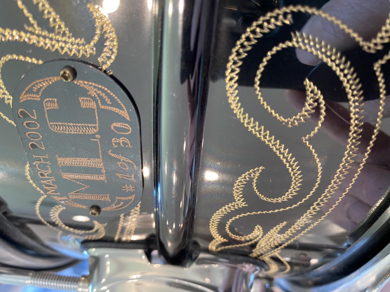 2001 5 x 14 10 lug Tama Kenny Aronoff Trackmaster Model: “The rejected prototype led first to a mass produced model with a hand-engraved shell, and eventually to this (5 x 14) Kenny Aronoff Trackmaster limited edition drum. Noted custom drum set artist John Douglas was commissioned to design a unique engraving pattern that would fit Kenny’s ideal. Thus the Twin Dragon pattern was created. Unlike the production models that had shells engraved in a much simpler pattern, Tama went all out on this model. Note the additional engraving on the lugs and rims. John Aldridge engraved all of the limited production drums. Only 42 of the 5 x 14s were produced and this drum is #32 of 42. There is a unique feature in the engraving pattern: the dragon’s head on the right is missing a nostril.”