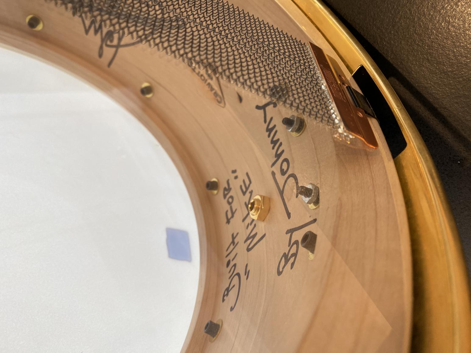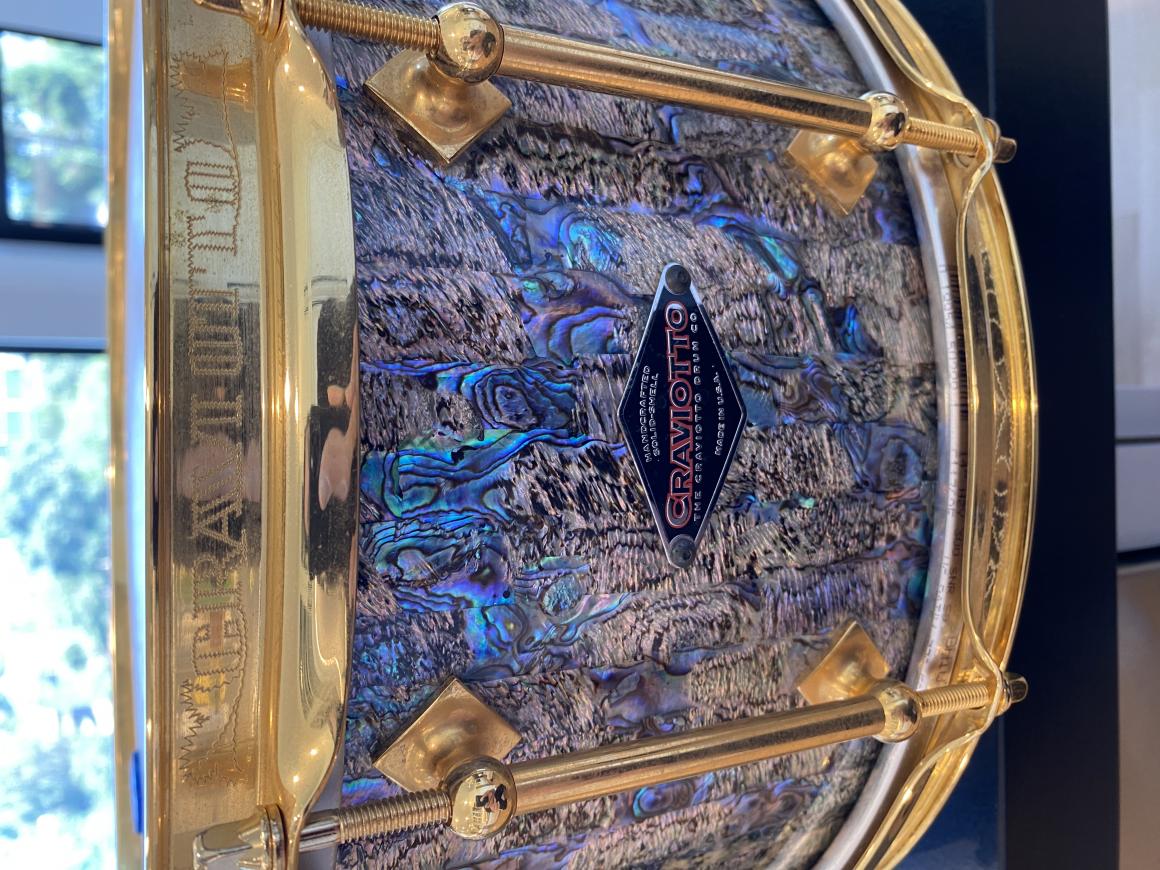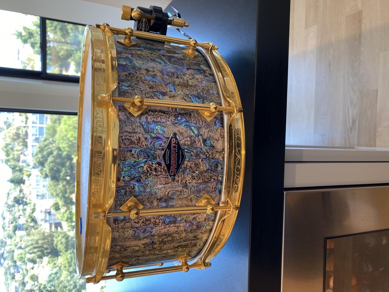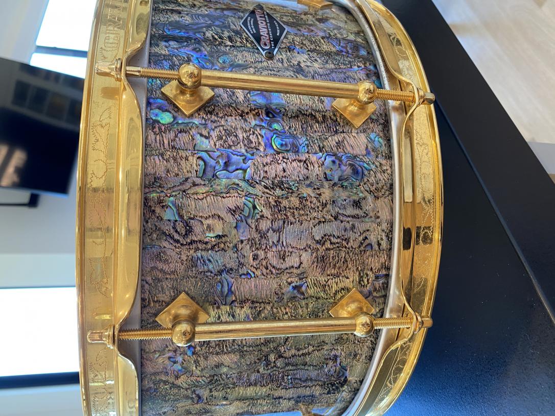 For a brief period of time Craviotto Drums partnered with C & C drums to offer a short run of snare drums and drum sets in various shades of real abalone shell material that was applied to the solid maple Craviotto shells. From what I remember there were only 1 or 2 drum sets made but I wasn’t sure how many snare drums were made so I consulted my good friend Steve Maxwell (President of the Craviotto Drum Co.) in order to get the facts correct. Steve’s reply was: “On the abalone: There were only two kits, that is correct. But, there were about 20 snares made. There were 4 different abalone used. One was almost like a bright orange burst (I had a 5 and a 6.5 and stupidly sold them), one was more of a white oyster look, one was almost like a black diamond but with some purples in it, and then your color. The problem was that the abalone didn’t work well with the solid shell because of the way the shell “breathes”. So, many of these snares were returned due to bubbling. I know of one of the orange burst that survived, and one of the black diamond style, plus your drum. Not sure about the rest of the short run. And, your snare is of course even more unique with the gold hardware. Not sure if any of the others in your finish survive. Steve”