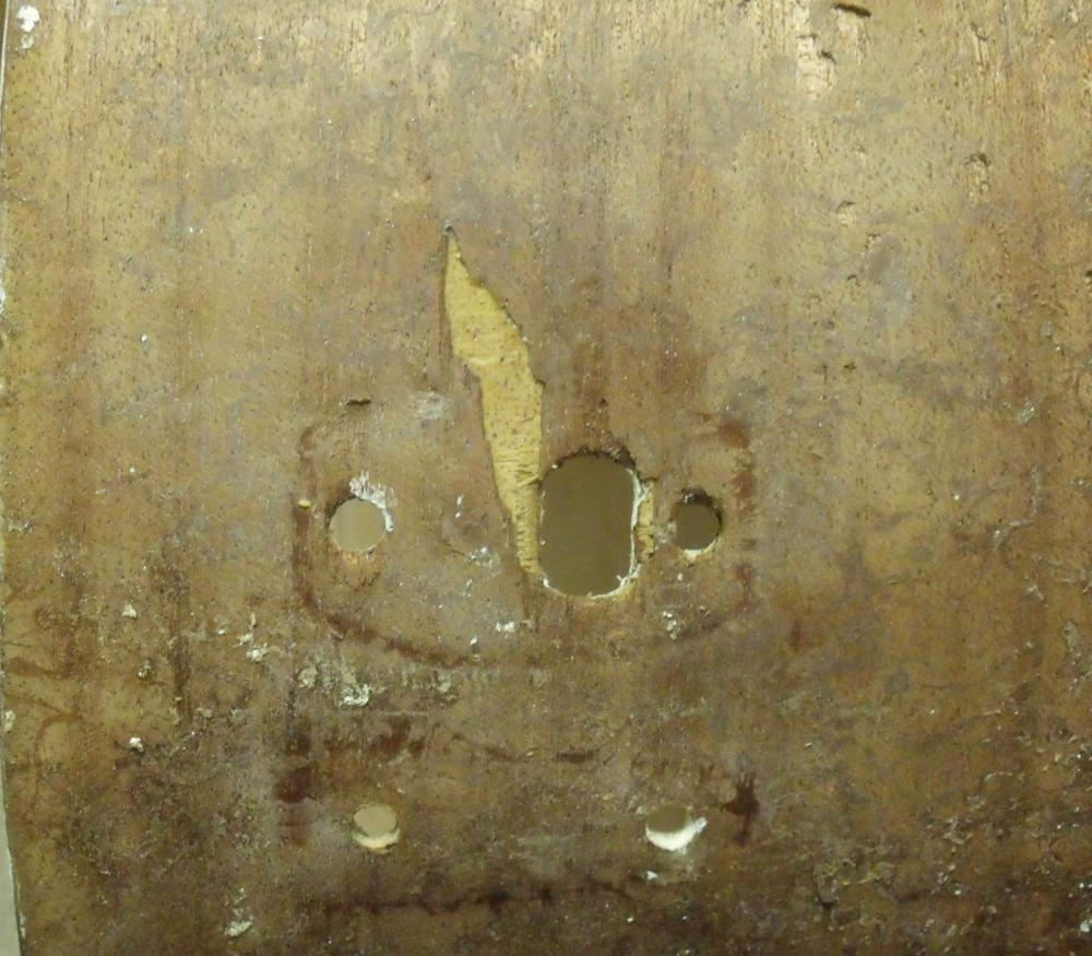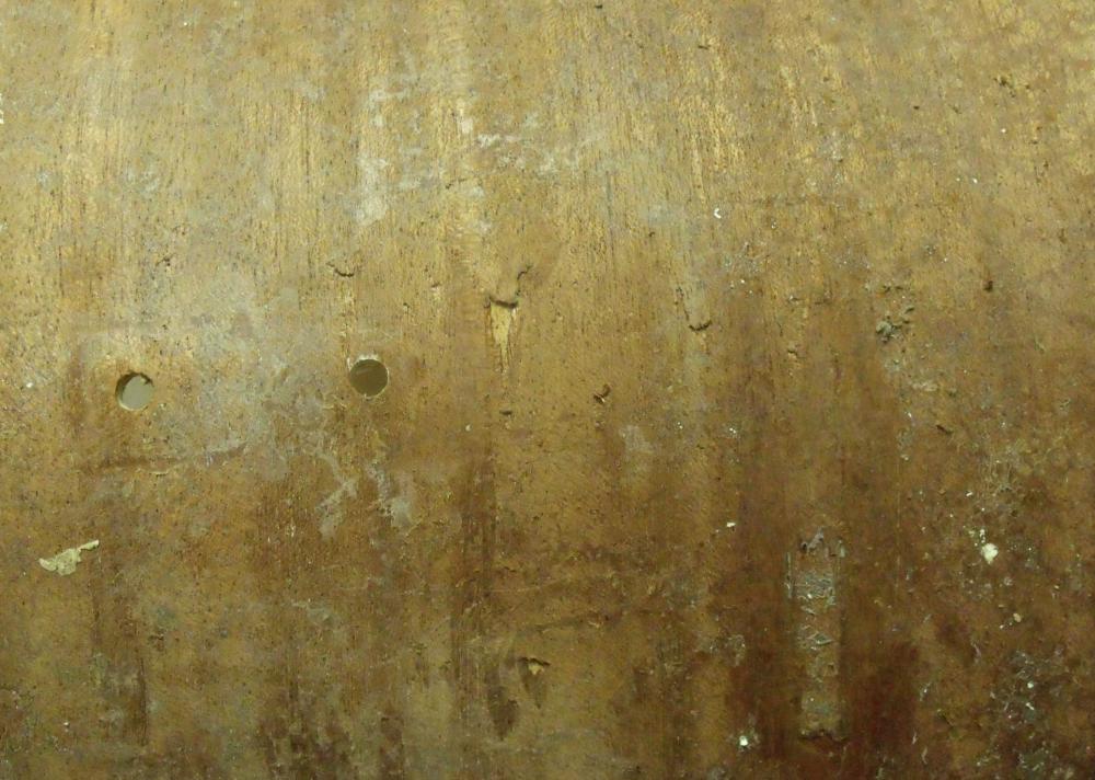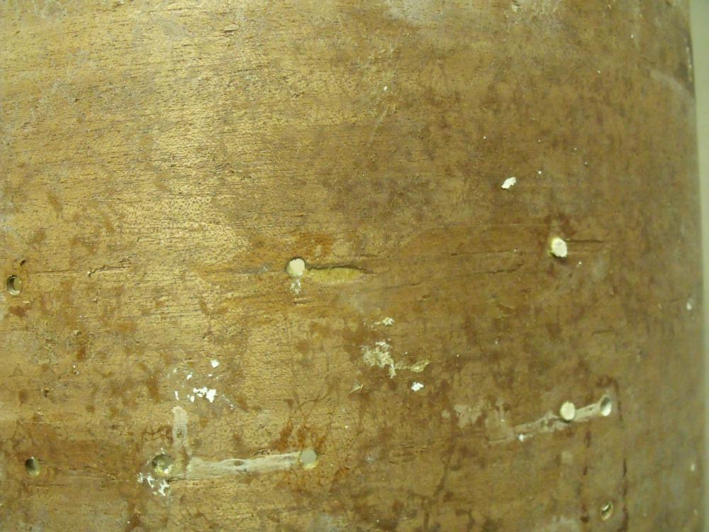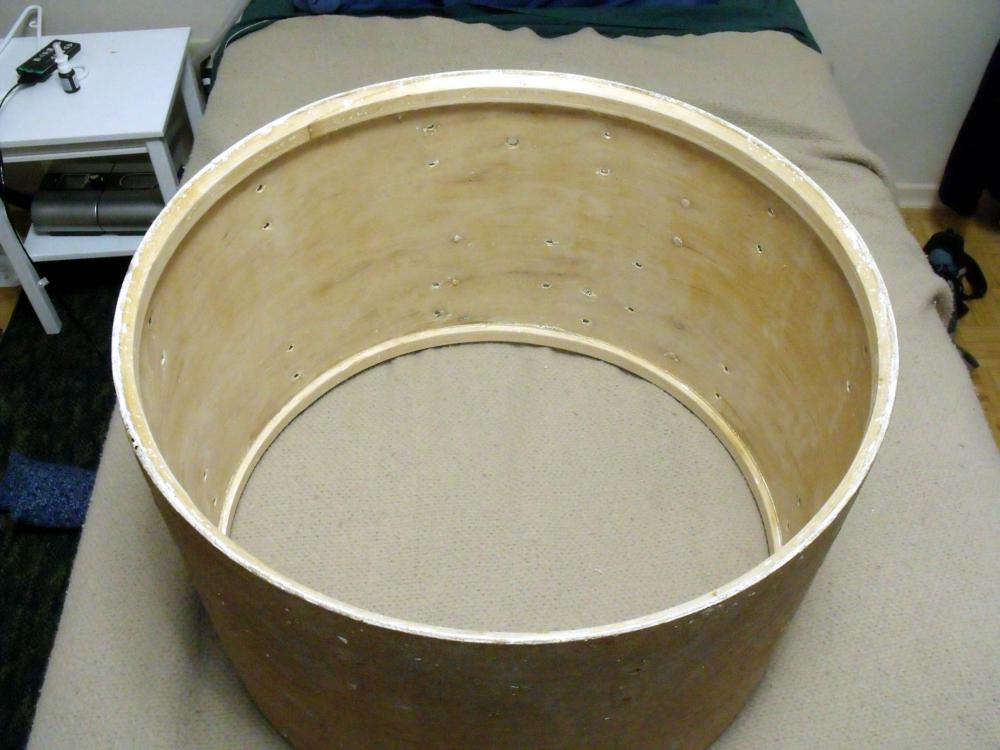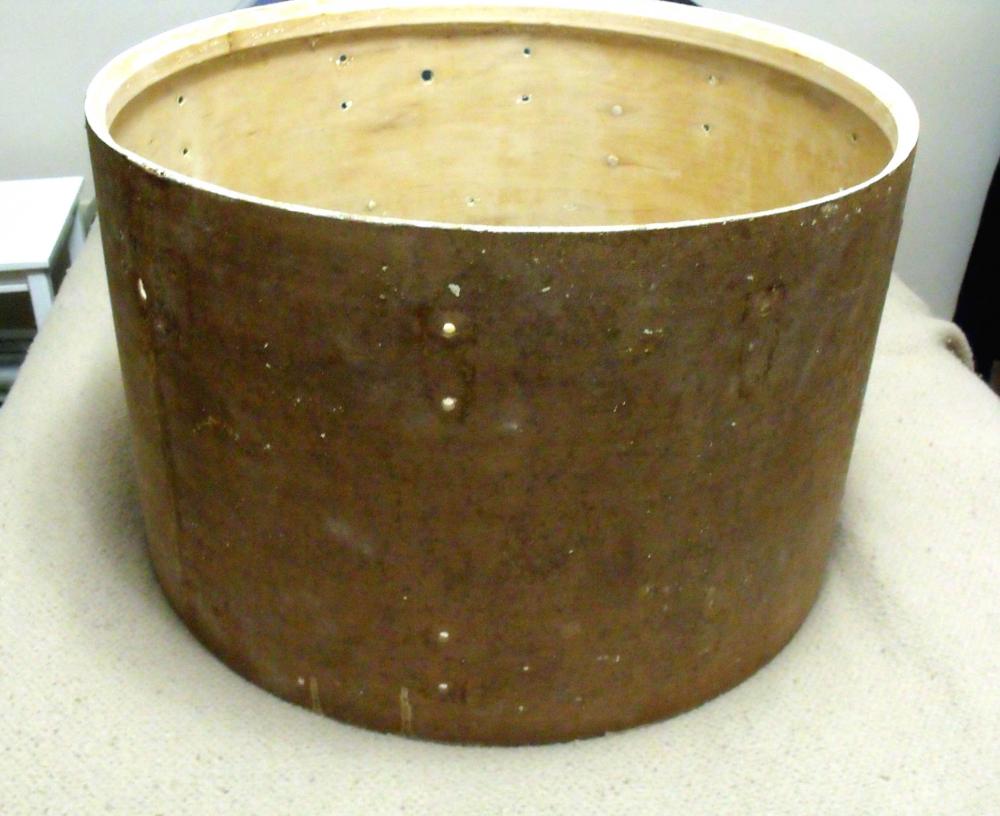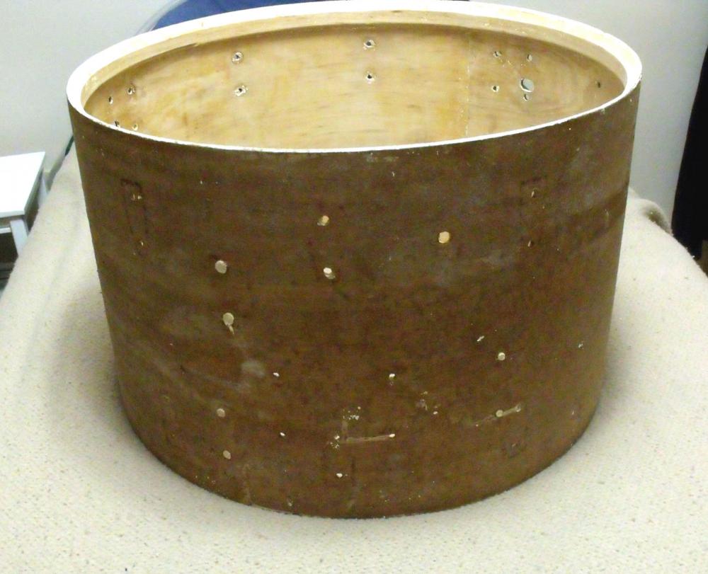 The shell is exactly how it looks in the pics. As you can see it needs work. The shell is round and has know cracks, splits or ply separation that I can see. Some idiot (NOT ME) painted the inside white. I remove almost all of the paint. Just needs to be sanded down and re-cleared inside. The outside mahogany is still pretty much intact. There is a couple spots where the mahogany came off. (SEE PICS). The rest is just glue residue. A good sanding and the outside should clean up very nice. Someone also drill 6 extra holes in it too. They drilled 2 so they could move the rail consolette to the centre. and the other 4 were drill for some kind of mount. I plugged the extra holes with poplar dowels. The ends just need to be sanded flat to the shell.