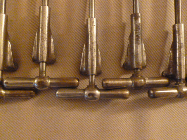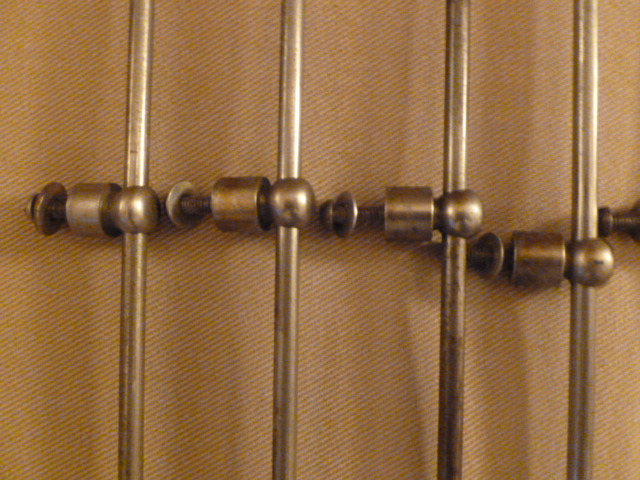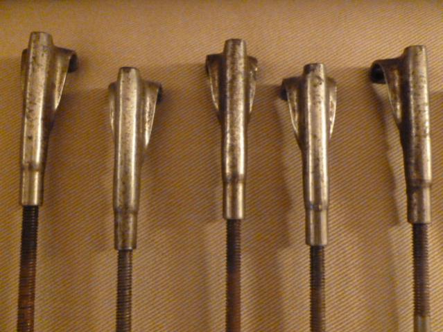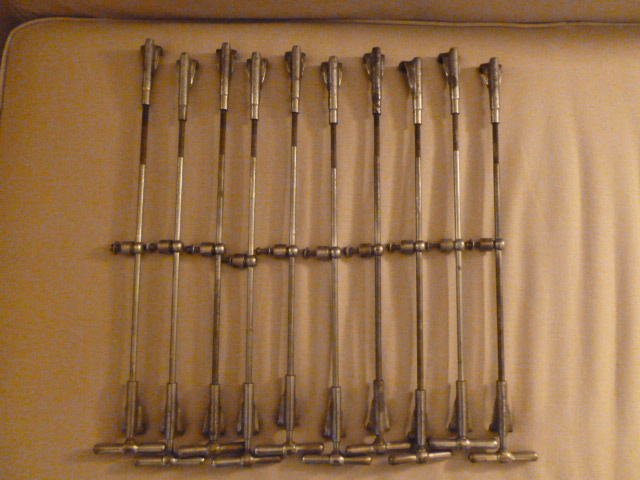 These are complete, with claws both ends and alignment brackets from the shell. All threaded parts move freely and easily. There are 10 of them, from a 1930s 25" Leedy bass drum.