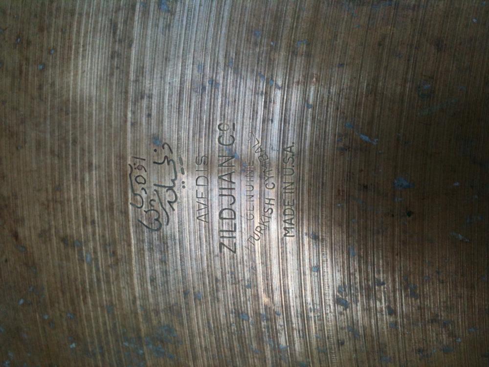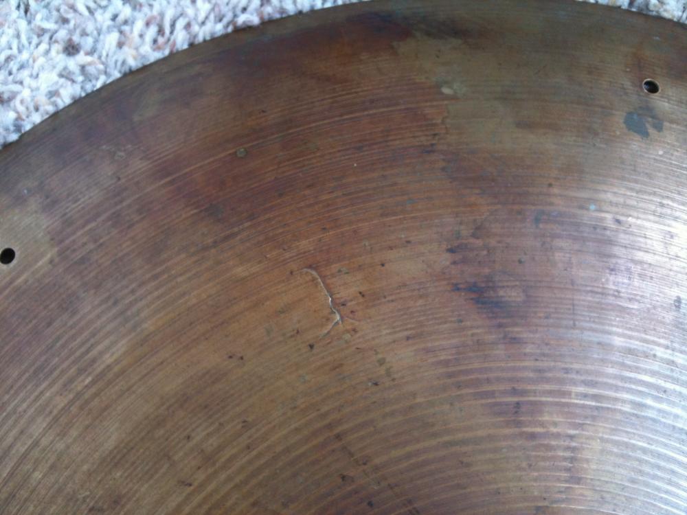 Has a crack in it, but appears very stable, since it's got it's own green patina inside it. You can hear the buzz of it a little when you play it. Has "2050 g" written on the underside of the bell.