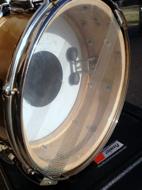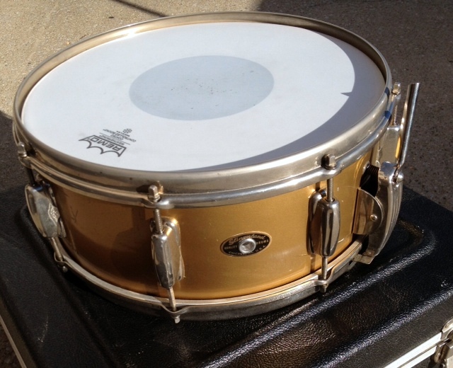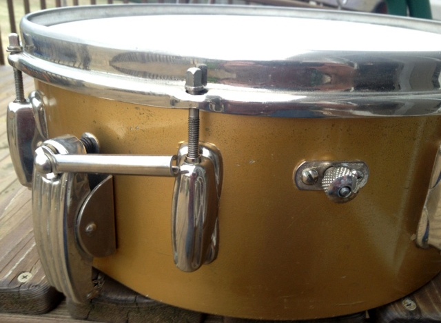 Super Gene Krupa '56 - '59 in original gold lacquer finish - which wasn't real common for Slingerland. 1-ply steam bent shell, no extra holes, NOB hoops, and all original except the lever (a repro from JP2). The clamshell has the inserts under each end of the snare wires.There are some nicks and scratches in the finish but overall its in very good shape. More pics available if you're interested. $475 obo and I'll ship it for free to the Lower 48.