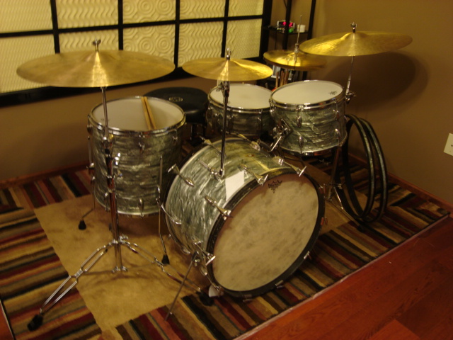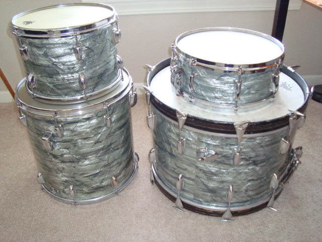 Here we have my 1958 Slingerland drum set in Light Blue Pearl finish. They sound great and are 100% ready for gigging or recording. The sizes are 13x9”, 16x16”, and 22x14” with a matching 14x5.5” 1 ply Radio King snare. PICTURES BELOW